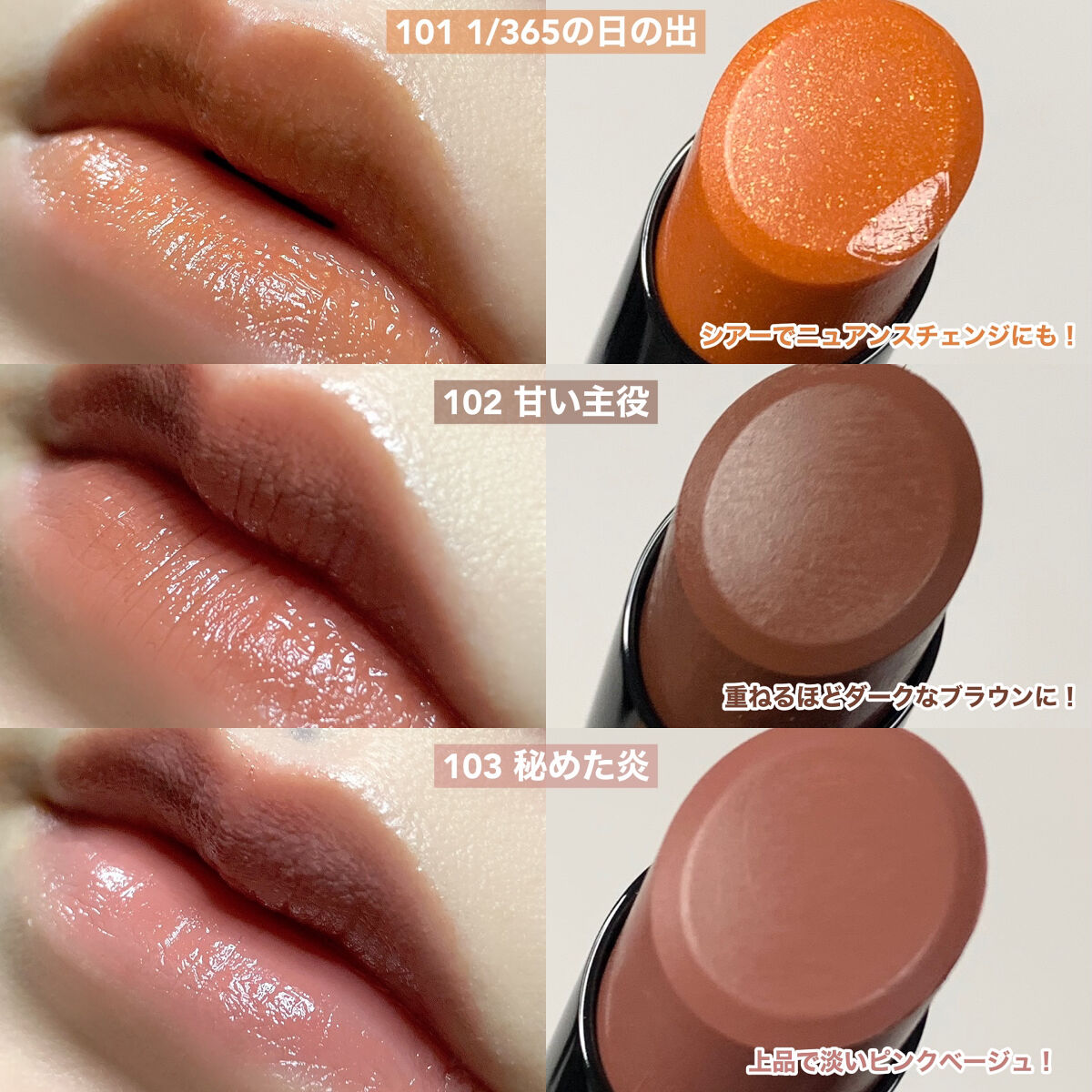 - <01 欲望の塊> テトライソステアリン酸ジペンタエリスリチル、トリ(カプリル酸/カプリン酸)グリセリル、オクチルドデカノール、ラウロイルグルタミン酸ジ(フィトステリル/オクチルドデシル)、ビスアルキル(C16-18)グリセリルウンデシルジメチコン、イソノナン酸イソトリデシル、水添ポリイソブテン、ラウロイルグルタミン酸ジ(オクチルドデシル/フィトステリル/ベヘニル)、パラフィン、合成ワックス、ダイマージリノール酸(フィトステリル/イソステアリル/セチル/ステアリル/ベヘニル)、マイクロクリスタリンワックス、水添マイクロクリスタリンワックス、ヒドロキシステアリン酸エチルヘキシル、トコフェロール、ホホバ種子油、オリーブ果実油、アーモンド油、(エチレン/プロピレン)コポリマー、ポリエチレン、ジメチコン、(+/-)(チタン/酸化チタン)焼結物、マイカ、ラウロイルアスパラギン酸Na、ラウロイルリシン、塩化亜鉛、酸化チタン、酸化鉄、水酸化Al、硫酸Ba、トリイソステアリン酸イソプロピルチタン、酸化スズ、ホウケイ酸(Ca/Al)、合成フルオロフロゴパイト、黄4、黄5、赤104(1)、赤201、赤202 <02 ピンクバナナ> テトライソステアリン酸ジペンタエリスリチル、トリ(カプリル酸/カプリン酸)グリセリル、オクチルドデカノール、ラウロイルグルタミン酸ジ(フィトステリル/オクチルドデシル)、ビスアルキル(C16-18)グリセリルウンデシルジメチコン、イソノナン酸イソトリデシル、水添ポリイソブテン、ラウロイルグルタミン酸ジ(オクチルドデシル/フィトステリル/ベヘニル)、パラフィン、合成ワックス、ダイマージリノール酸(フィトステリル/イソステアリル/セチル/ステアリル/ベヘニル)、マイクロクリスタリンワックス、水添マイクロクリスタリンワックス、ヒドロキシステアリン酸エチルヘキシル、トコフェロール、ホホバ種子油、オリーブ果実油、アーモンド油、(エチレン/プロピレン)コポリマー、ポリエチレン、ジメチコン、(+/-)(チタン/酸化チタン)焼結物、マイカ、ラウロイルアスパラギン酸Na、ラウロイルリシン、塩化亜鉛、酸化チタン、酸化鉄、水酸化Al、硫酸Ba、トリイソステアリン酸イソプロピルチタン、酸化スズ、ホウケイ酸(Ca/Al)、合成フルオロフロゴパイト、黄4、黄5、赤104(1)、赤201、赤202 <03 陽炎> テトライソステアリン酸ジペンタエリスリチル、トリ(カプリル酸/カプリン酸)グリセリル、オクチルドデカノール、ラウロイルグルタミン酸ジ(フィトステリル/オクチルドデシル)、ビスアルキル(C16-18)グリセリルウンデシルジメチコン、イソノナン酸イソトリデシル、水添ポリイソブテン、ラウロイルグルタミン酸ジ(オクチルドデシル/フィトステリル/ベヘニル)、パラフィン、合成ワックス、ダイマージリノール酸(フィトステリル/イソステアリル/セチル/ステアリル/ベヘニル)、マイクロクリスタリンワックス、水添マイクロクリスタリンワックス、ヒドロキシステアリン酸エチルヘキシル、トコフェロール、ホホバ種子油、オリーブ果実油、アーモンド油、(エチレン/プロピレン)コポリマー、ポリエチレン、ジメチコン、(+/-)(チタン/酸化チタン)焼結物、マイカ、ラウロイルアスパラギン酸Na、ラウロイルリシン、塩化亜鉛、酸化チタン、酸化鉄、水酸化Al、硫酸Ba、トリイソステアリン酸イソプロピルチタン、酸化スズ、ホウケイ酸(Ca/Al)、合成フルオロフロゴパイト、黄4、黄5、赤104(1)、赤201、赤202 <04 パンプキンワイン> テトライソステアリン酸ジペンタエリスリチル、トリ(カプリル酸/カプリン酸)グリセリル、オクチルドデカノール、ラウロイルグルタミン酸ジ(フィトステリル/オクチルドデシル)、ビスアルキル(C16-18)グリセリルウンデシルジメチコン、イソノナン酸イソトリデシル、水添ポリイソブテン、ラウロイルグルタミン酸ジ(オクチルドデシル/フィトステリル/ベヘニル)、パラフィン、合成ワックス、ダイマージリノール酸(フィトステリル/イソステアリル/セチル/ステアリル/ベヘニル)、マイクロクリスタリンワックス、水添マイクロクリスタリンワックス、ヒドロキシステアリン酸エチルヘキシル、トコフェロール、ホホバ種子油、オリーブ果実油、アーモンド油、(エチレン/プロピレン)コポリマー、ポリエチレン、ジメチコン、(+/-)(チタン/酸化チタン)焼結物、マイカ、ラウロイルアスパラギン酸Na、ラウロイルリシン、塩化亜鉛、酸化チタン、酸化鉄、水酸化Al、硫酸Ba、トリイソステアリン酸イソプロピルチタン、酸化スズ、ホウケイ酸(Ca/Al)、合成フルオロフロゴパイト、黄4、黄5、赤104(1)、赤201、赤202 <05 ダークフィグ> テトライソステアリン酸ジペンタエリスリチル、トリ(カプリル酸/カプリン酸)グリセリル、オクチルドデカノール、ラウロイルグルタミン酸ジ(フィトステリル/オクチルドデシル)、ビスアルキル(C16-18)グリセリルウンデシルジメチコン、イソノナン酸イソトリデシル、水添ポリイソブテン、ラウロイルグルタミン酸ジ(オクチルドデシル/フィトステリル/ベヘニル)、