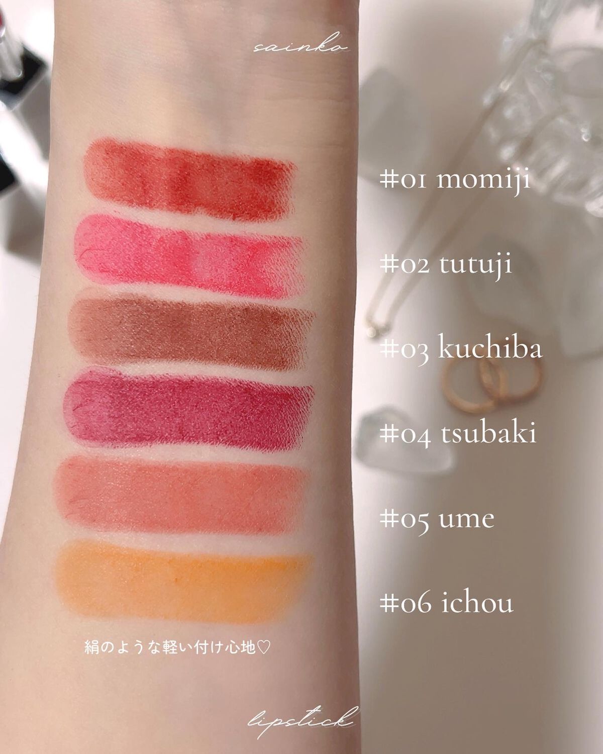 - #01 momoji スクワラン、ジメチコン、ビスジグリセリルポリアシルアジペート-2、ポリエチレン、オゾケライト、ナイロン-12、フェニルトリメチコン、リンゴ酸ジイソステアリル、(ビニルジメチコン/メチコンシルセスキオキサン)クロスポリマー、トリメリト酸トリトリデシル、マイクロクリスタリンワックス、ジメチコンクロスポリマー、パルミチン酸エチルヘキシル、ヒマワリ種子油、ベニバナ花エキス、クチナシ花エキス、キク花エキス、ウメ花エキス、エチルヘキシルグリセリン、酢酸トコフェロール、トリ(カプリル酸/カプリン酸)グリセリル、フェノキシエタノール、BHT(+/-)酸化鉄、黄5、赤104(1)、赤202、酸化チタン、赤201 #02 tutuji スクワラン、ジメチコン、ビスジグリセリルポリアシルアジペート-2、ポリエチレン、オゾケライト、ナイロン-12、フェニルトリメチコン、リンゴ酸ジイソステアリル、(ビニルジメチコン/メチコンシルセスキオキサン)クロスポリマー、トリメリト酸トリトリデシル、マイクロクリスタリンワックス、ジメチコンクロスポリマー、パルミチン酸エチルヘキシル、ヒマワリ種子油、ベニバナ花エキス、クチナシ花エキス、キク花エキス、ウメ花エキス、エチルヘキシルグリセリン、酢酸トコフェロール、トリ(カプリル酸/カプリン酸)グリセリル、フェノキシエタノール、BHT(+/-)酸化鉄、黄5、赤104(1)、赤202、酸化チタン、赤201 #03 kuchiba スクワラン、ジメチコン、ビスジグリセリルポリアシルアジペート-2、ポリエチレン、オゾケライト、ナイロン-12、フェニルトリメチコン、リンゴ酸ジイソステアリル、(ビニルジメチコン/メチコンシルセスキオキサン)クロスポリマー、トリメリト酸トリトリデシル、マイクロクリスタリンワックス、ジメチコンクロスポリマー、パルミチン酸エチルヘキシル、ヒマワリ種子油、ベニバナ花エキス、クチナシ花エキス、キク花エキス、ウメ花エキス、エチルヘキシルグリセリン、酢酸トコフェロール、トリ(カプリル酸/カプリン酸)グリセリル、フェノキシエタノール、BHT(+/-)酸化鉄、黄5、赤104(1)、赤202、酸化チタン、赤201 #04 tsubaki スクワラン、ジメチコン、ビスジグリセリルポリアシルアジペート-2、ポリエチレン、オゾケライト、ナイロン-12、フェニルトリメチコン、リンゴ酸ジイソステアリル、(ビニルジメチコン/メチコンシルセスキオキサン)クロスポリマー、トリメリト酸トリトリデシル、マイクロクリスタリンワックス、ジメチコンクロスポリマー、パルミチン酸エチルヘキシル、ヒマワリ種子油、ベニバナ花エキス、クチナシ花エキス、キク花エキス、ウメ花エキス、エチルヘキシルグリセリン、酢酸トコフェロール、トリ(カプリル酸/カプリン酸)グリセリル、フェノキシエタノール、BHT(+/-)酸化鉄、黄5、赤104(1)、赤202、酸化チタン、赤201 #05 ume スクワラン、ジメチコン、ビスジグリセリルポリアシルアジペート-2、ポリエチレン、オゾケライト、ナイロン-12、フェニルトリメチコン、リンゴ酸ジイソステアリル、(ビニルジメチコン/メチコンシルセスキオキサン)クロスポリマー、トリメリト酸トリトリデシル、マイクロクリスタリンワックス、ジメチコンクロスポリマー、パルミチン酸エチルヘキシル、ヒマワリ種子油、ベニバナ花エキス、クチナシ花エキス、キク花エキス、ウメ花エキス、エチルヘキシルグリセリン、酢酸トコフェロール、トリ(カプリル酸/カプリン酸)グリセリル、フェノキシエタノール、BHT(+/-)酸化鉄、黄5、赤104(1)、赤202、酸化チタン、赤201 #06 ichou スクワラン、ジメチコン、ビスジグリセリルポリアシルアジペート-2、ポリエチレン、オゾケライト、ナイロン-12、フェニルトリメチコン、リンゴ酸ジイソステアリル、(ビニルジメチコン/メチコンシルセスキオキサン)クロスポリマー、トリメリト酸トリトリデシル、マイクロクリスタリンワックス、ジメチコンクロスポリマー、パルミチン酸エチルヘキシル、ヒマワリ種子油、ベニバナ花エキス、クチナシ花エキス、キク花エキス、ウメ花エキス、エチルヘキシルグリセリン、酢酸トコフェロール、トリ(カプリル酸/カプリン酸)グリセリル、フェノキシエタノール、BHT(+/-)酸化鉄、黄5、赤104(1)、赤202、酸化チタン、赤201 #07 sakura 水添ポリイソブテン、リンゴ酸ジイソステアリル、ポリイソブテン、ポリエチレン、シア脂、ミツロウ、ジ安息香酸PG、トリ(カプリル酸/カプリン酸)グリセリル、テトライソステアリン酸ペンタエリスリチル、ヘキサ(ヒドロキシステアリン酸/ステアリン酸/ロジン酸)ジペンタエリスリチル、ビスジグリセリルポリアシルアジペート-2、香料、t-ブチルメトキシジベンゾイルメタン、パルミチン酸エチルヘキシル、メトキシケイヒ酸エチルヘキシル、サリチル酸エチルヘキシル、フェノキシエタノール、黄5、赤104(1)、赤218 #08 kuchinashi 水添ポリイソブテン、リンゴ酸ジイソステアリル、ポリイソブテン、ポリエチレン、シア脂、ミツロウ、エタノール、オクチルドデカノー