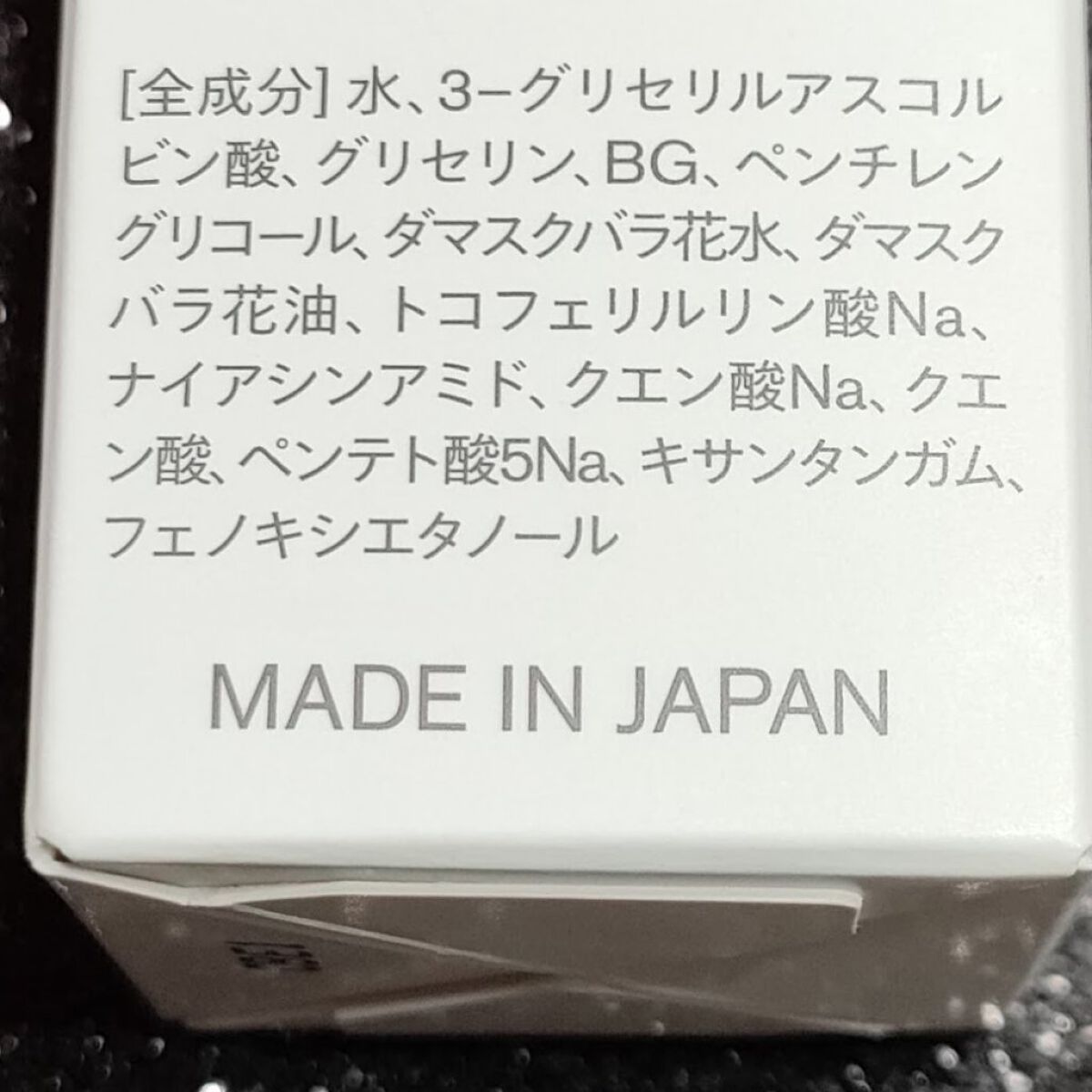 - <10ml> 水、3-グリセリルアスコルビン酸、グリセリン、BG、ペンチレングリコール、ダマスクバラ花水、ダマスクバラ花油、トコフェリルリン酸Na、ナイアシンアミド、クエン酸Na、クエン酸、ペンテト酸5Na、キサンタンガム、フェノキシエタノール <30ml> 水、3-グリセリルアスコルビン酸、グリセリン、BG、ペンチレングリコール、ダマスクバラ花水、ダマスクバラ花油、トコフェリルリン酸Na、ナイアシンアミド、クエン酸Na、クエン酸、ペンテト酸5Na、キサンタンガム、フェノキシエタノール