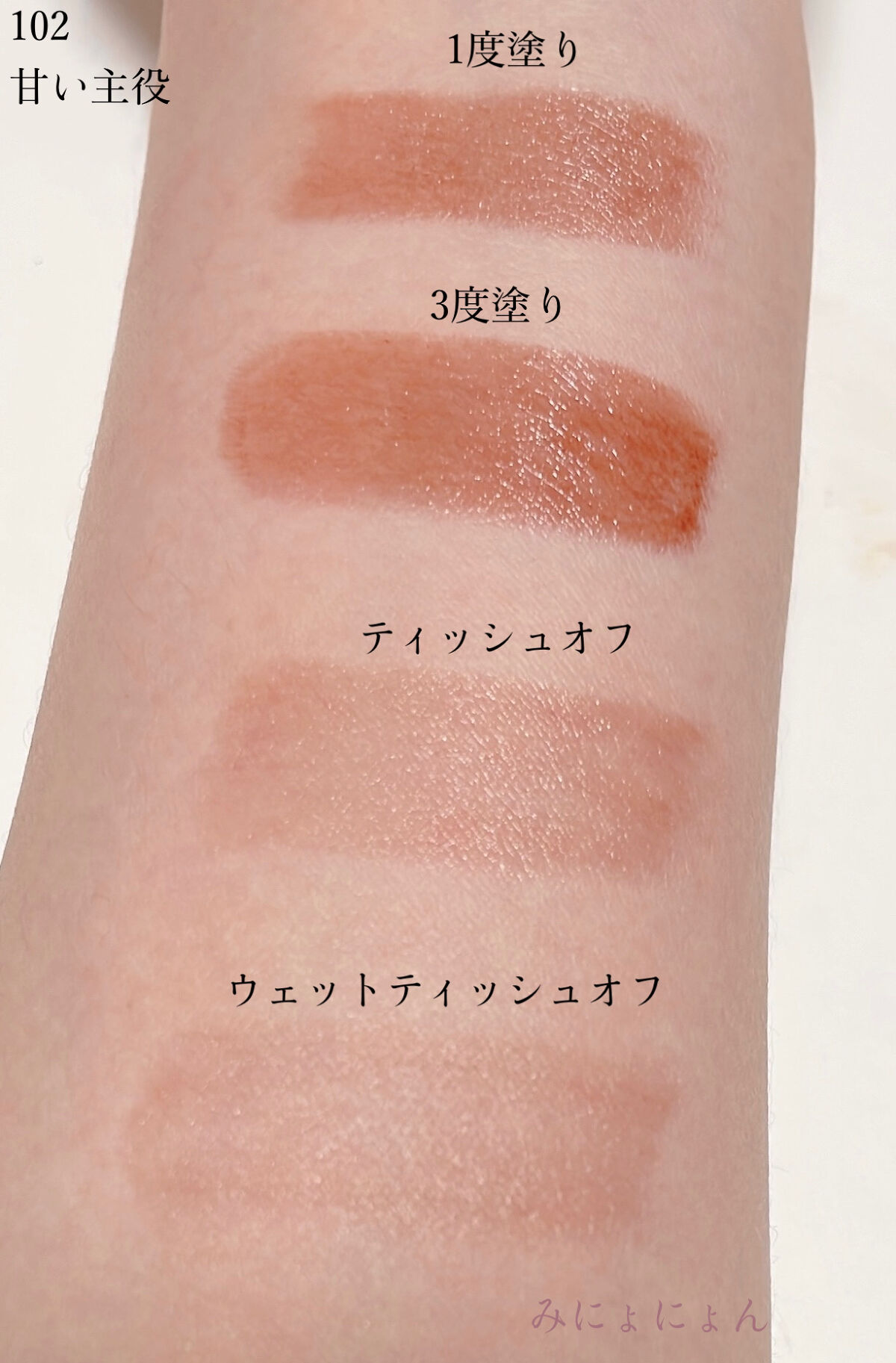101は、オレンジイエローってどうなのって思いましたが、塗ると心配ゼロ。ゴールドパールがめちゃかわいい🤤🤍うっとりするほどぷるんと輝いてまるでオレンジゼリーみたいな唇になります🍊 102は、2月のイメージだけあって濃厚なチョコレートみたいな感じ。塗ると、なんと大人っぽ💋媚びない私みたいな落ちついた唇になれます🤍これは所持してるリップと重ね塗りしても使えそうなカラーです 103は、ミルクティーブラウンとの表記ですが塗るとね、なんかショコラピンクみたいなすっごく可愛い優しいカラーです🥹🤍桜の花びらが唇にふわりとのって色づいたようなむちゃかわな唇になれます🌸