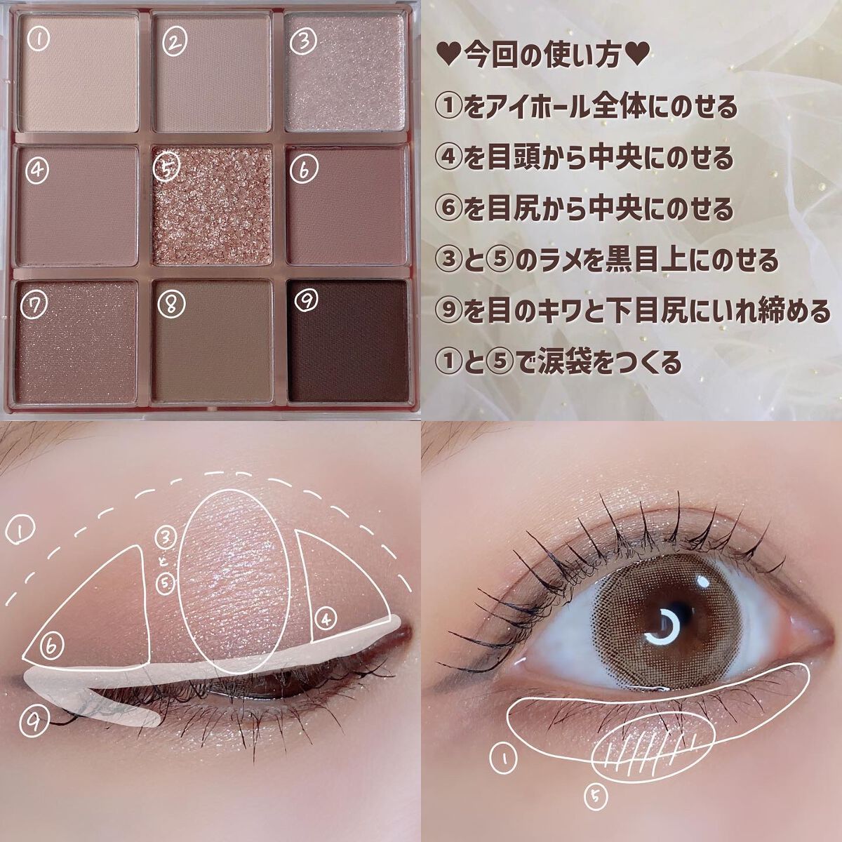 ピンクブラウン系の9色パレットです!赤みのある色味でかわいいです😌 マット、シマー、ラメ、グリッターとさまざまな質感のアイシャドウがセットされているので、使い方次第で色々なメイクが楽しめると思います🥰 発色はいいですが、ふわっとしていてボカしやすくとても使いやすかったです!粉飛びもなく、一日中ヨレずによかったです👏