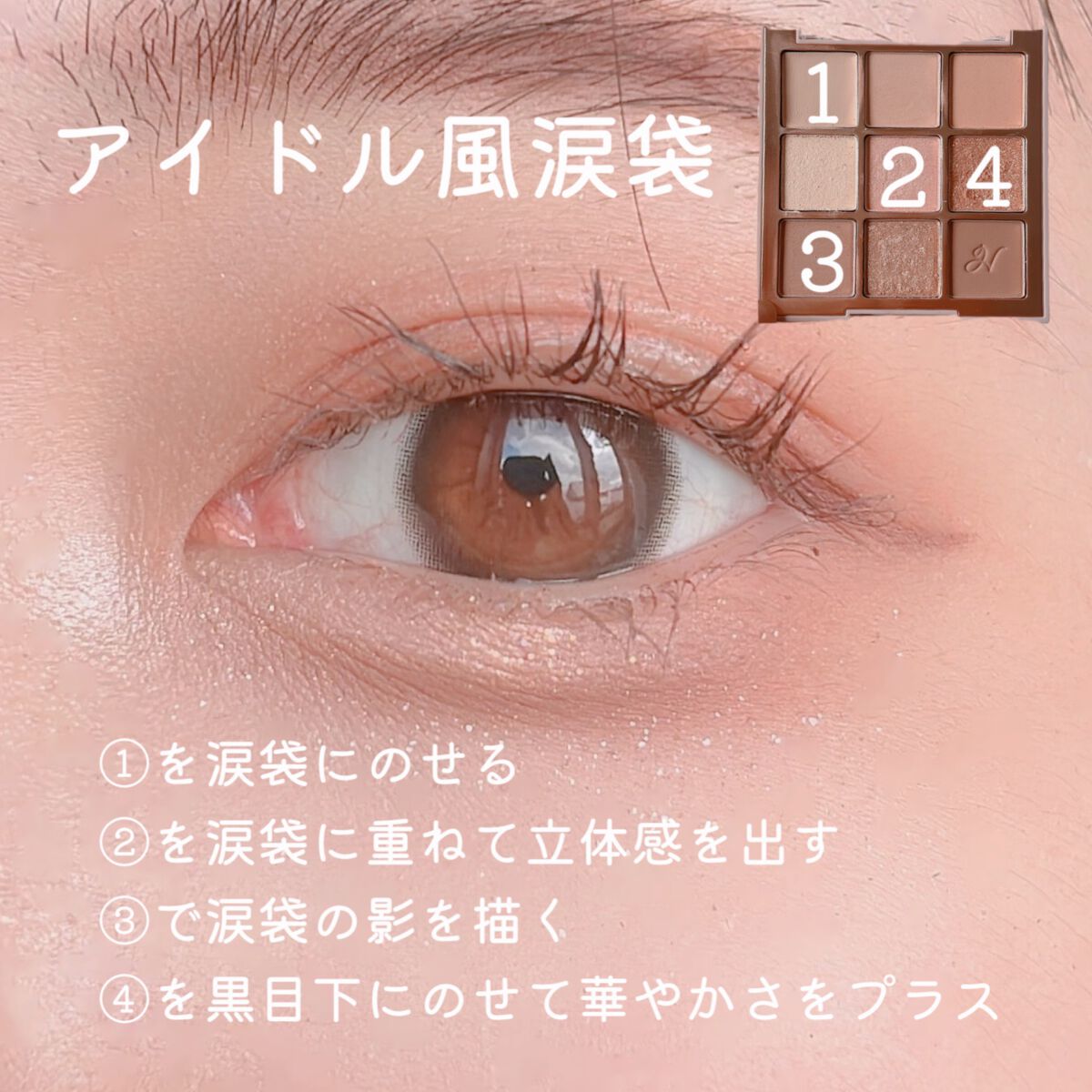 - 涙袋用コンシーラー入りの9色アイシャドウパレット。涙袋用コンシーラーや涙袋の影カラー、涙袋を立体的にみせるハイピグメントのラメやハイライターが入った9色パレットです。これ1つで様々なニュアンスの「涙袋メイク」や「下まぶたメイク」を楽しめます。