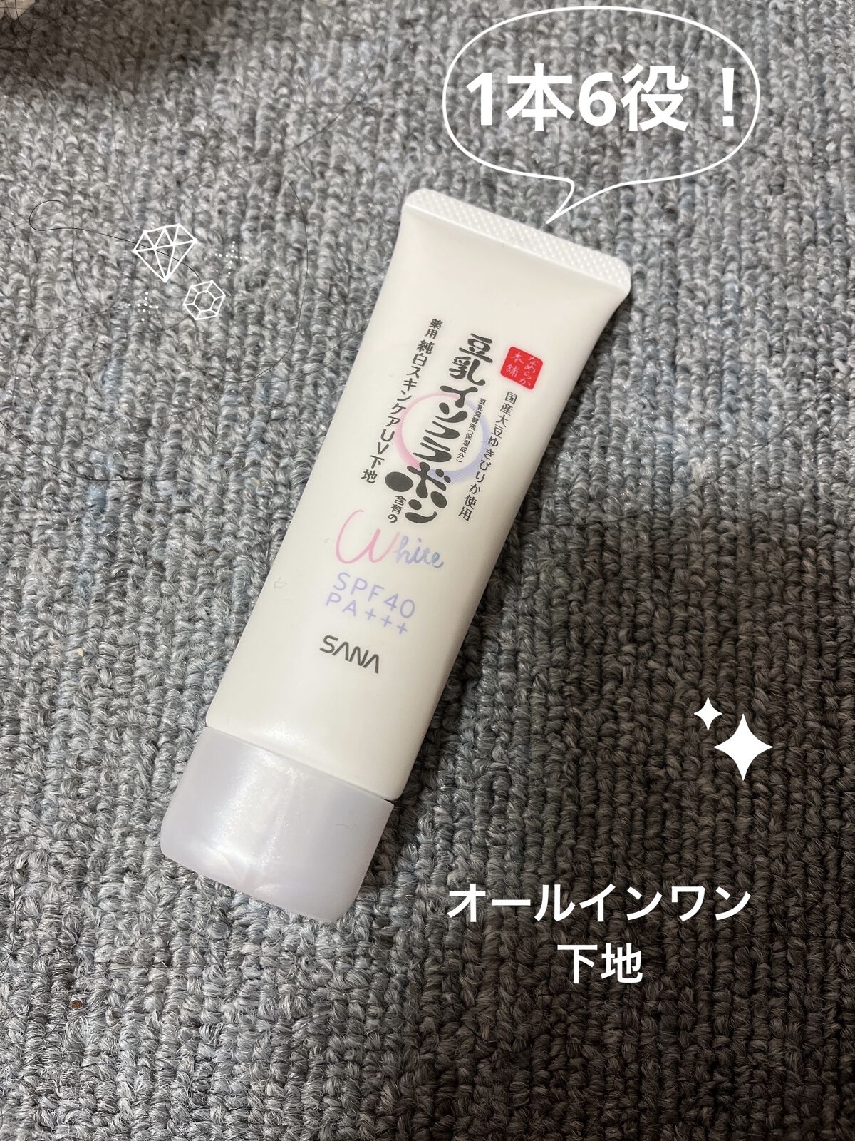 - <薬用美白スキンケアUV下地> 豆乳の美白スキンケアUV下地。肌荒れ&ニキビ予防しながら美白!メラニンの生成を抑え、シミ・そばかすを防ぎます。トーンアップ(メイク効果による)&皮脂崩れ防止。化粧水・美容液・乳液・クリーム・UVカット・化粧下地の1本6役。SPF40・PA+++。[販売名:サナ なめらか本舗 薬用美白スキンケアUV下地]