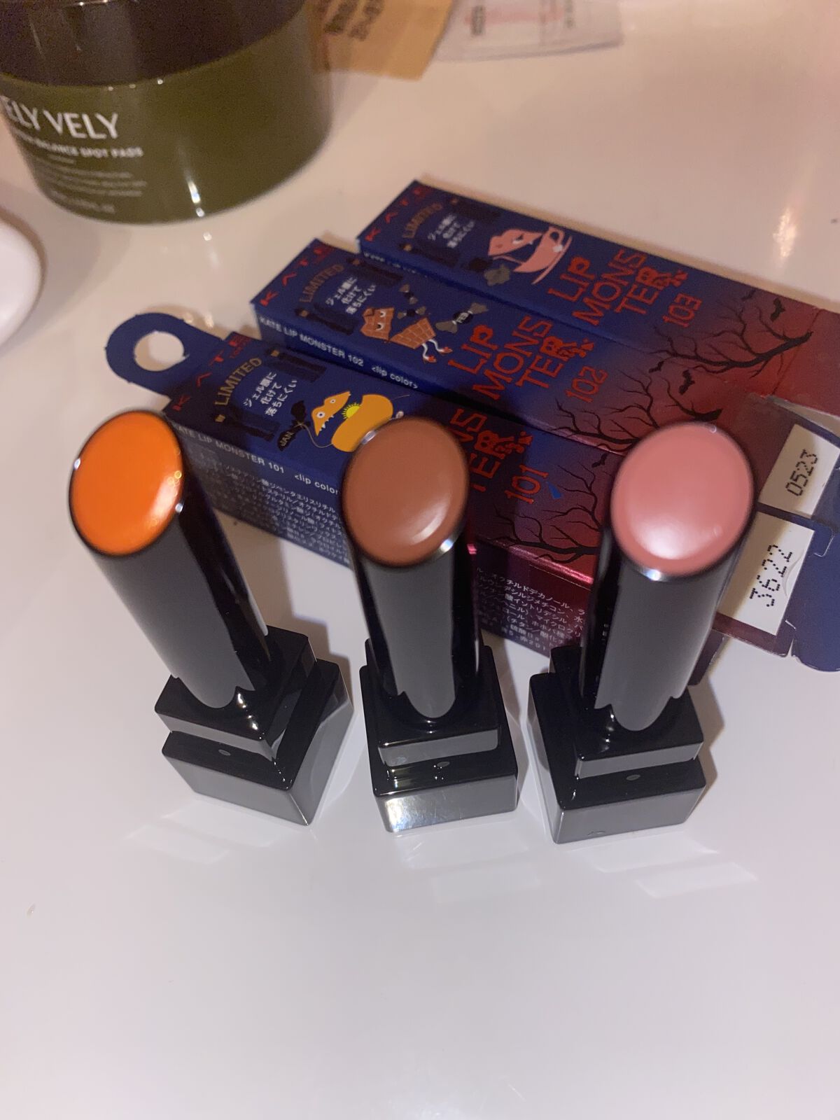 KATE リップモンスター 102 甘い主役 103 秘めた炎 104 桜色のひと時 106 夜雲の涙 107 紅折り紙の願い 110 闇夜のファンファーレ 112 真夜中の褒美 手持ちの7色を並べてみました #KATE #リップモンスター #マイリップモンスター