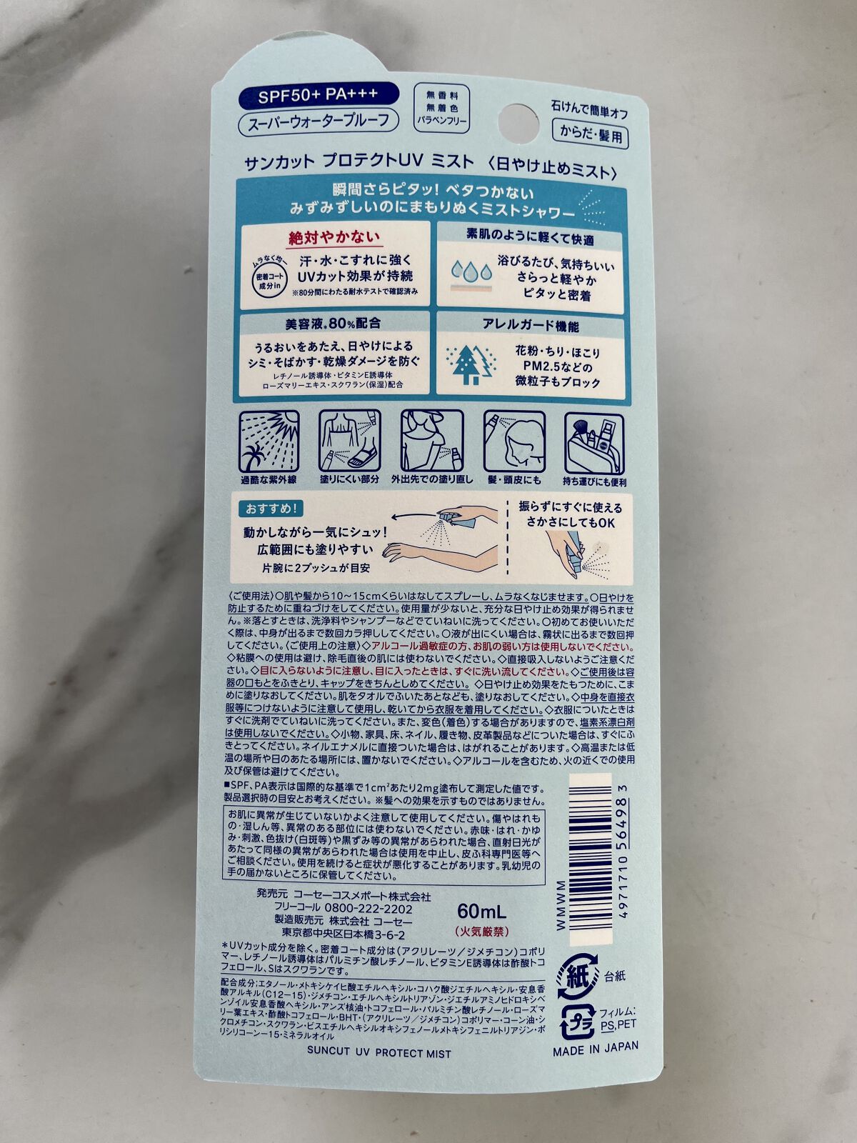 - 1.瞬間さらピタッ! べたつきにくいUVミストシャワー 2.美容液※1 80%配合 UVダメージをケア レチノール誘導体※2・ビタミンE誘導体※3・ローズマリーエキス・スクワラン(保湿)配合 無香料・無着色・パラベンフリー 3.アレルガード機能※4 花粉などをブロック ※1 UVカット成分を除く ※2 パルミチン酸レチノール ※3 酢酸トコフェロール ※4 花粉・ちり・ほこり・PM2.5などをブロックする機能