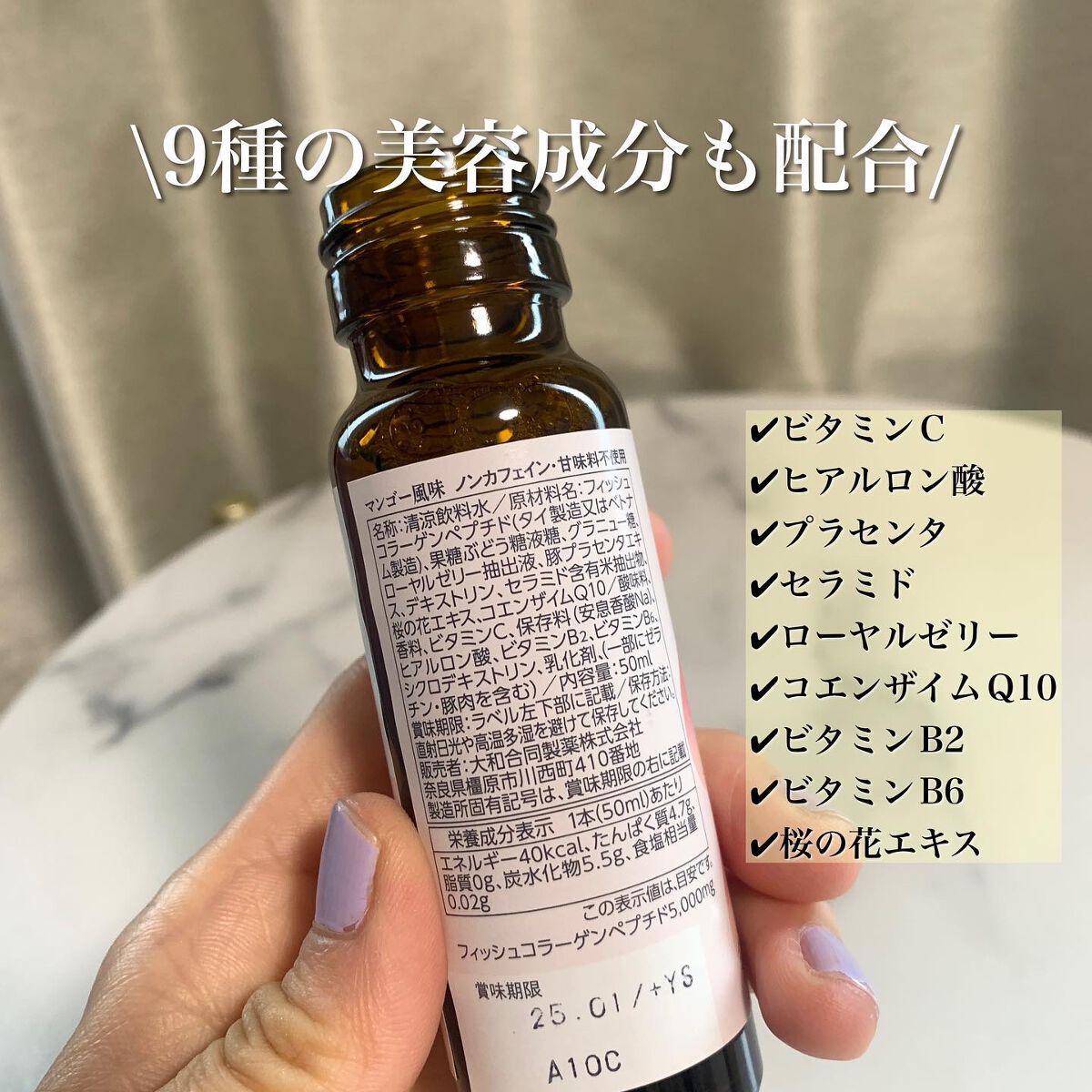 12種の美容成分を贅沢配合。美を生み出し続けるサイクルに着目した独自設計。スーパー果実由来の美容特許成分(コケモモ+アムラ果実)に加え、トマト種子エキス、桜の花エキス、GABA、クロセチン、低分子コラーゲン、ヒアルロン酸、セラミド、ビタミンC、さらに大人にうれしいローヤルゼリー、クロマメノキを配合。 きれいなオレンジ色のサラッとしたドリンク。ミックスフルーツ風味。クセなく、甘すぎず、甘酸っぱさが美味しくてハマっちゃう。ジュース感覚なおいしさ。ノンカフェイン・脂質ゼロなので夜寝る前に飲むのもおすすめ。 1日1本目安で毎日続けたいアイテム。