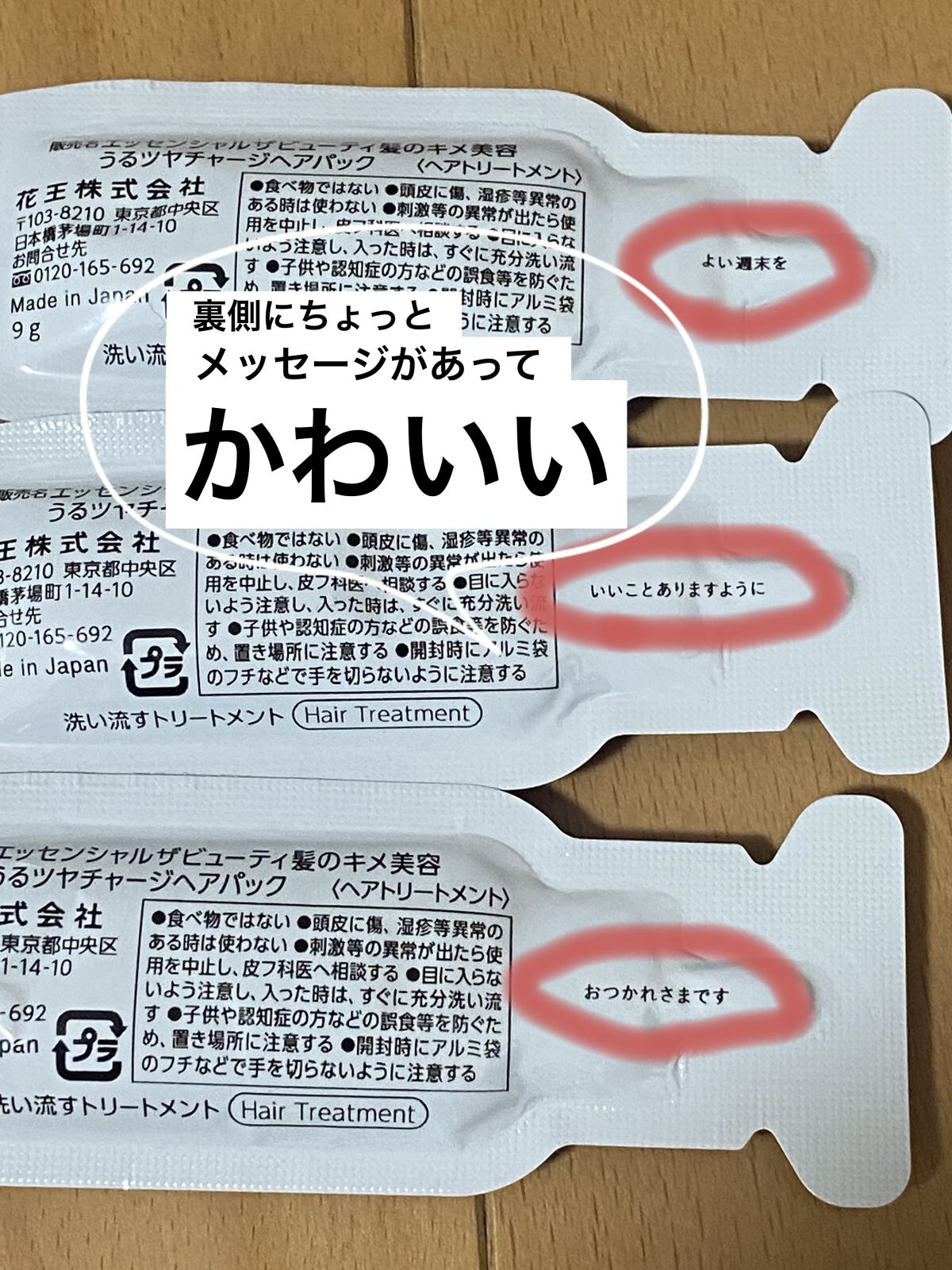 - ○カラーやアイロン、髪のおしゃれを思いっきり楽しみたい人に ○週1回のスペシャルケアで、サロン帰りのような美しい髪*へ(*なめらかでまとまりのある状態) 〇サロン発想のトリートメントプロセスがこの1包に! ○サロンのトリートメントプロセス ・ハイダメージ*を芯まで集中補修。(*繰り返すカラーやブリーチ・アイロンの熱によるダメージ) ・髪表面のキューティクルを補修 ・キューティクルの保護効果の持続 〇うるツヤチャージ処方 ・浸透補修成分配合:セラミドES*(補修)(*ビスメトキシプロピルアミドイソドコサン) ・天然由来の美髪オイル18-MEA OIL*配合(毛髪保護)(*ラノリン脂肪酸) ・7種の厳選美容液成分配合:ヒアルロン酸Na・加水分解コラーゲン・ローヤルゼリーエキス・ローズヒップオイル・ホホバホイル・ツバキオイル・乳酸(つや付与・保湿) 〇アイロン熱による髪ダメージや温度・摩擦等から髪を守り続ける”美髪バリア持続テクノロジー” 〇フローラルリュクスの香り