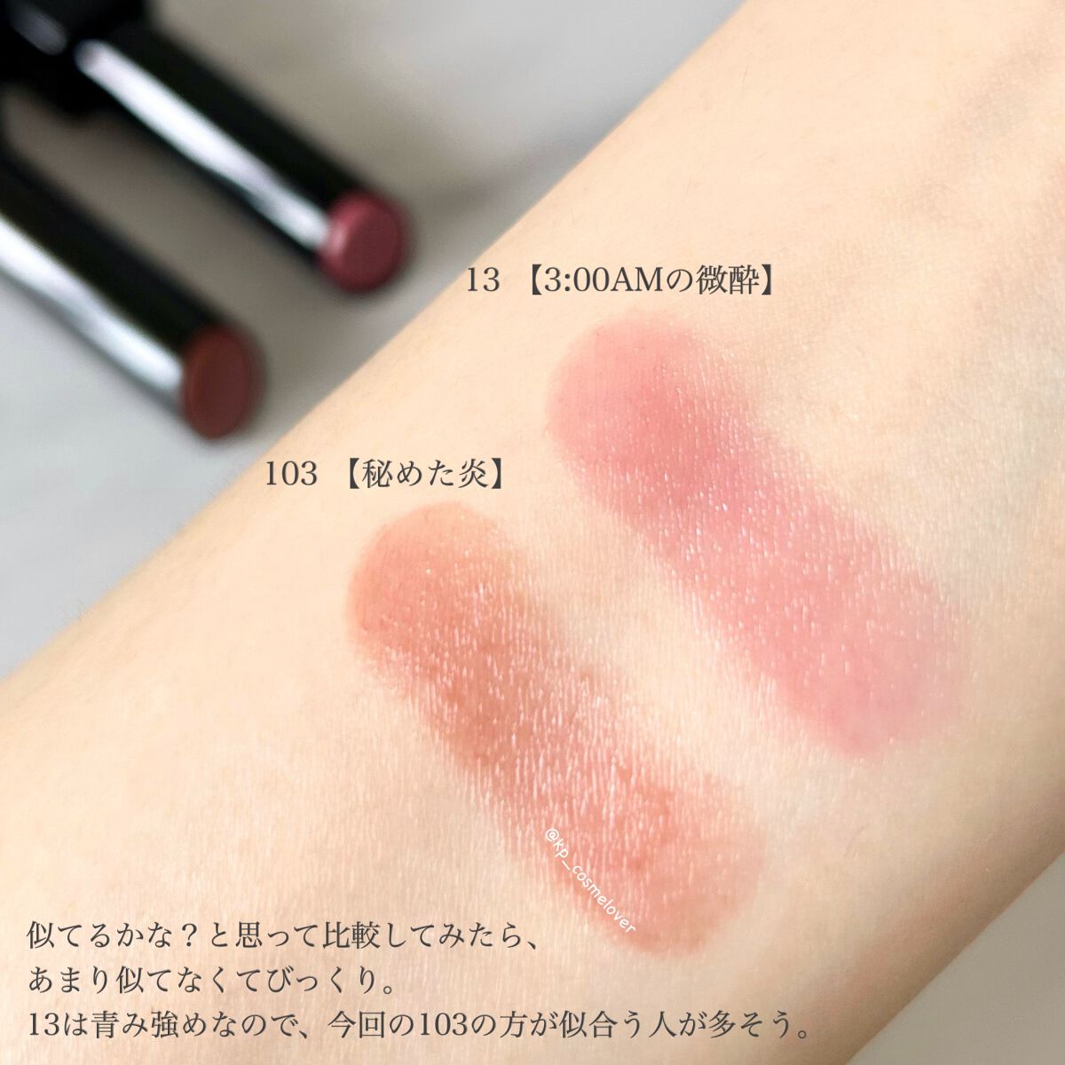 保湿力が高く、最近唇が荒れやすい私でも問題なく使えました❣️ シアーな発色で、リップクリーム感覚でぐりぐりと塗っていますが、色味と艶感が絶妙🤤 ティッシュオフしなくてもマスクにつきにくく、色持ちもすごく良いです💋 今まで買わなかったことに後悔しかないです😫 次はどの色を買おうか、今からワクワクしています💕