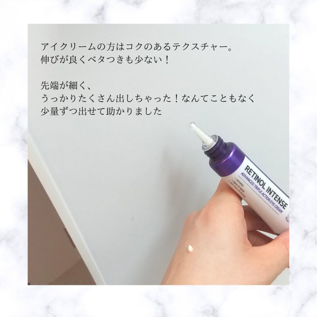とろっと固め、まるでハチミツのテクスチャー。 効果絶大! お風呂上がりの温かい手で目元にハンドプレスすると本当に気持ち良い(*´▽`) パッケージデザインも高級感があり、ワンランク上のスキンケアをしている気持ちになれます(#^.^#)