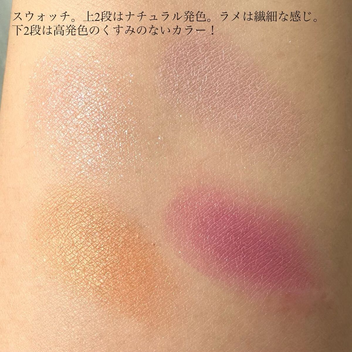 このパレットは、黄味が少なめでブルベにも使いやすいブラウン。 発色はしっかり目だけど、ブラシで調節も可能なので幅広い人に使いやすいパレットだと思います🎀✨ ラメ感も少しずつ異なり、華やかさを抑えたい時は右上を多めに使うと品の良いツヤのあるピンクブラウンメイクになります💎✨ 左上のラメカラーは白っぽいのでどんなアイシャドウとも相性抜群! この可愛い色味と煌びやかなラメは唯一無二です!