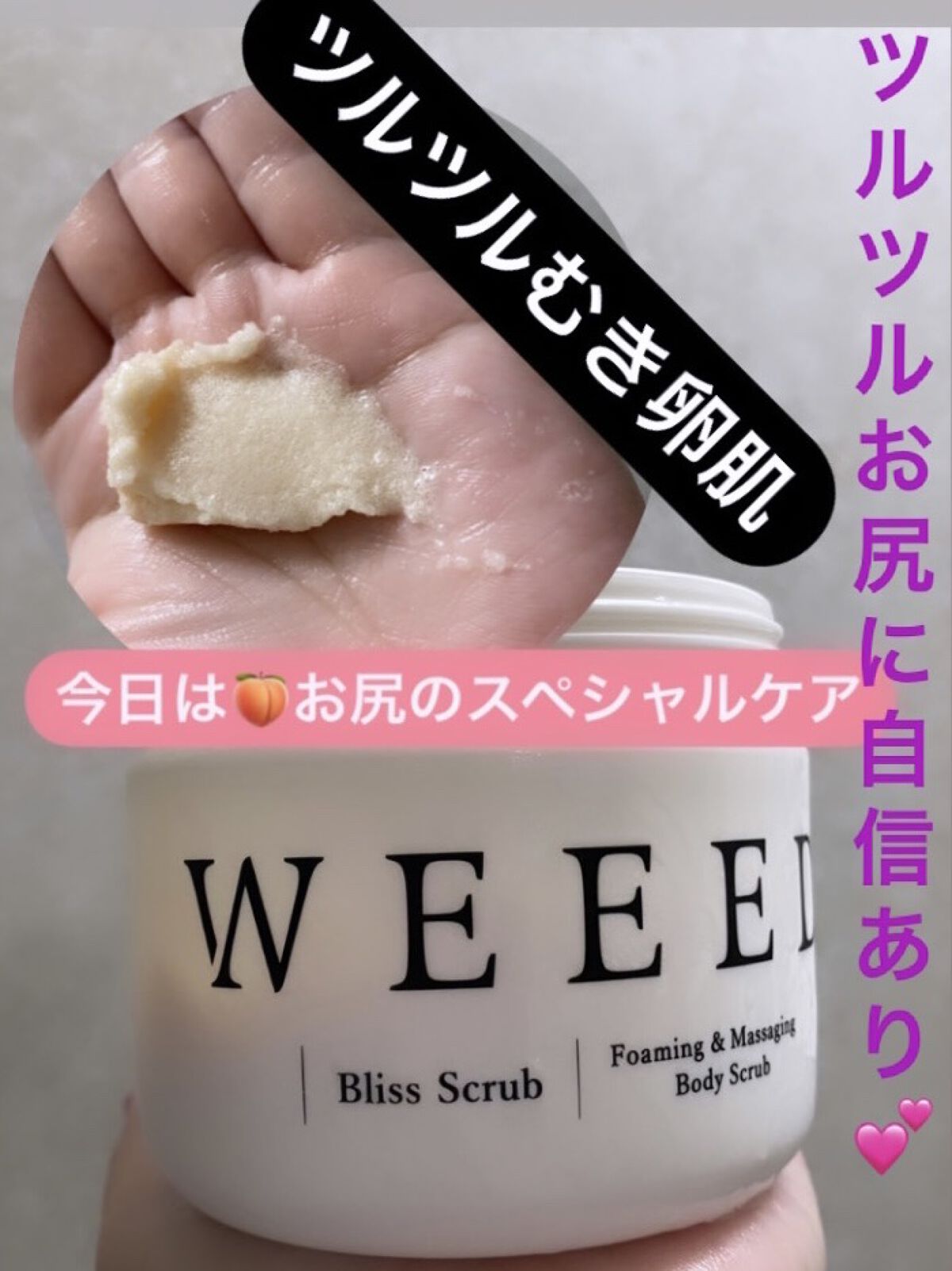 - 【医薬部外品】魅せるための薬用ボディスクラブ「WEEED Bliss Scrub」(ウィード ブリススクラブ)です。ニキビ予防、体臭予防、清浄・殺菌、保湿・潤いをケアします。シーソルトスクラブで、角質層を優しい使い心地でオフします。しっかり泡立ててボディソープとしてご利用も可能です。