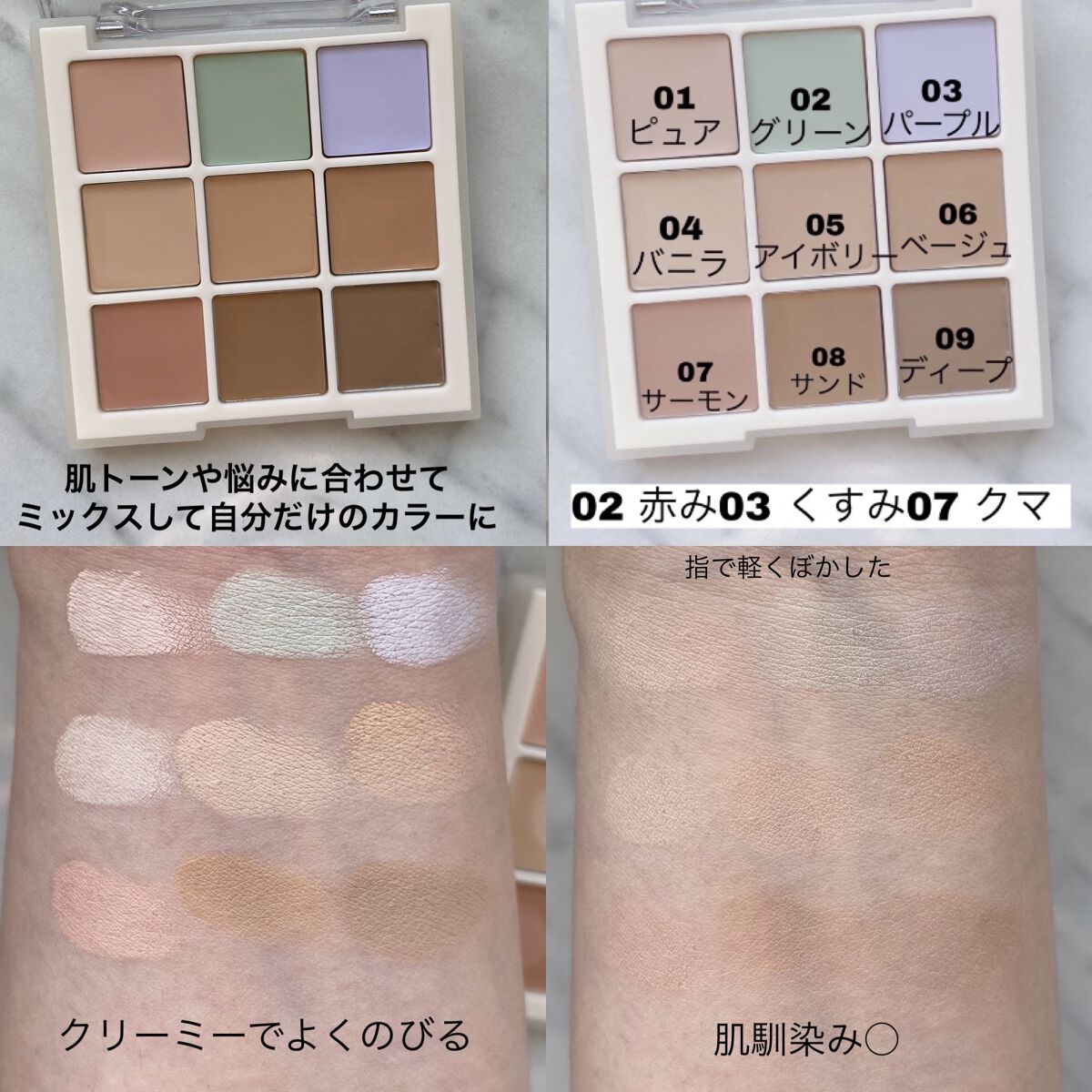 - 様々な肌トーンを考慮した9つのカバーシェードで全ての肌タイプの欠点をカバー補正してくれるカスタムコンシーラーパレット。 【Point1】様々な肌トーンと明るさを考えに入れた9つのカバーシェード。 【Point2】肌トーンに合う自分だけのカラーでカスタマイズ。 【Point3】反対色を活用したカラーコレクティングメイクアップ。 【Point4】浮きにくく密着感の高いしっとり&もっちりテクスチャー。