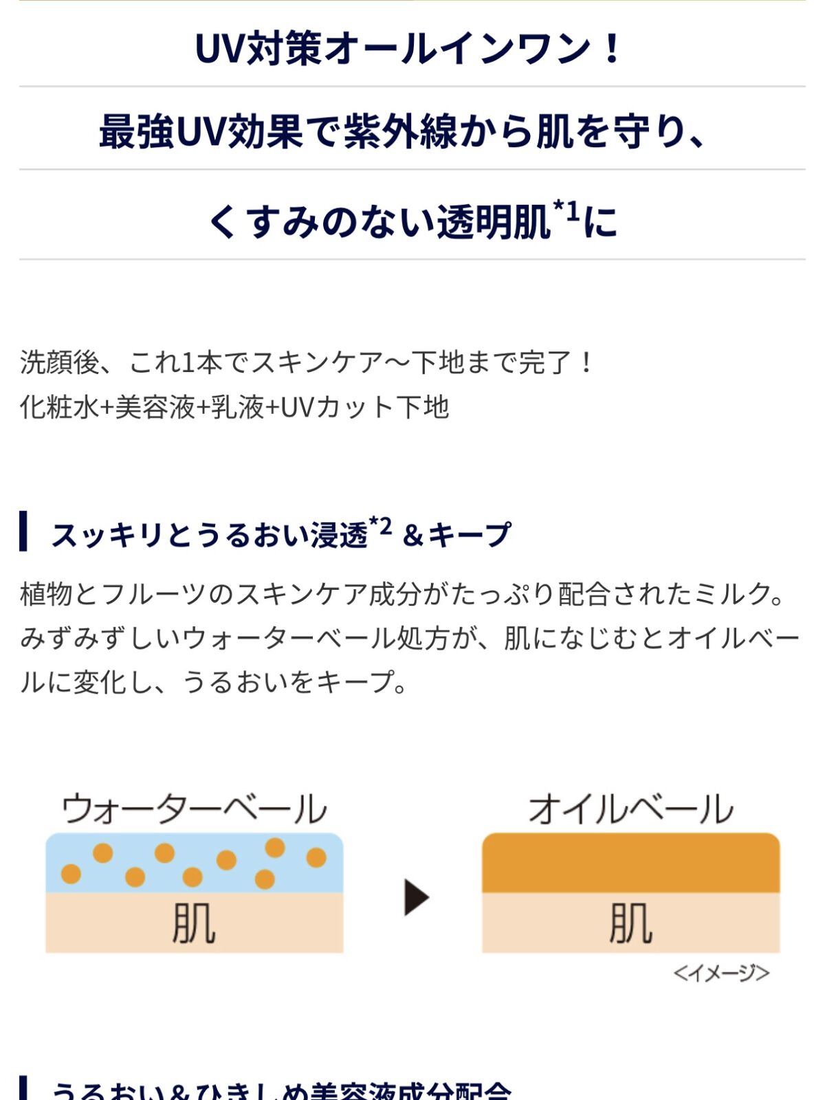 - 朝のUV対策オールインワン! 化粧水・美容液・乳液のスキンケア機能と、UVカットの下地がひとつになったオールインワンミルク 洗顔後、これ1本でスキンケアからUVカット効果がある下地まで完了。肌にうるおいを与えながら、国内最高水準のUVカット効果で紫外線から肌を守ります。ひんやりメントールで、シャキッとお目覚め効果も。 ◆SPF50+/PA++++ ◆美容液成分うるおいベールでしっとりキープ ◆引き締め成分で紫外線をガードし、トーンアップ効果(*)も ◆シトラスフルーツとハーブの爽やかですっきりした香り * メイク効果による