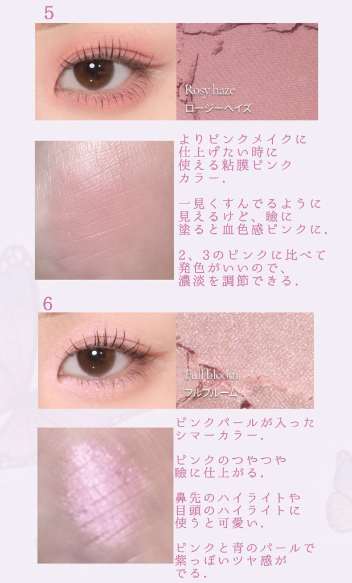 ・マット7色、ラメ1色、シマー1色、グリッター1色 好きな質感に仕上げられるパレットになってます. ・パープルで透明感メイク、ピンクで可愛らしいメイクができます. ・全体的に淡い発色で濃淡の調節がしやすくて、すごく濃いメイクにならない. ・ブラウンが苦手なので締め色が淡いカラーなのが嬉しい. ・パープルは白みとピンクみが強めなのでバブリーにならない. ・瞼のくすみが気になっていたのですが、1のベースカラーを使用すると綺麗にくすみが飛んで気にならなくなった. ・マットが好きなのでマットが多めで嬉しい. ・ラメカラーがどれもかわいい. ・マットは粉飛びするものが多いですが、これはしっとり質感で粉飛びしない. ・なんと言っても全ての色がかわいすぎる!!! ・くすみが苦手な人. ・韓国っぽい白みピンクのメイクがしたい人. ・濃い締め色が苦手な人. ・ラメやシマーで質感を変えて使えるカラーを探して人.