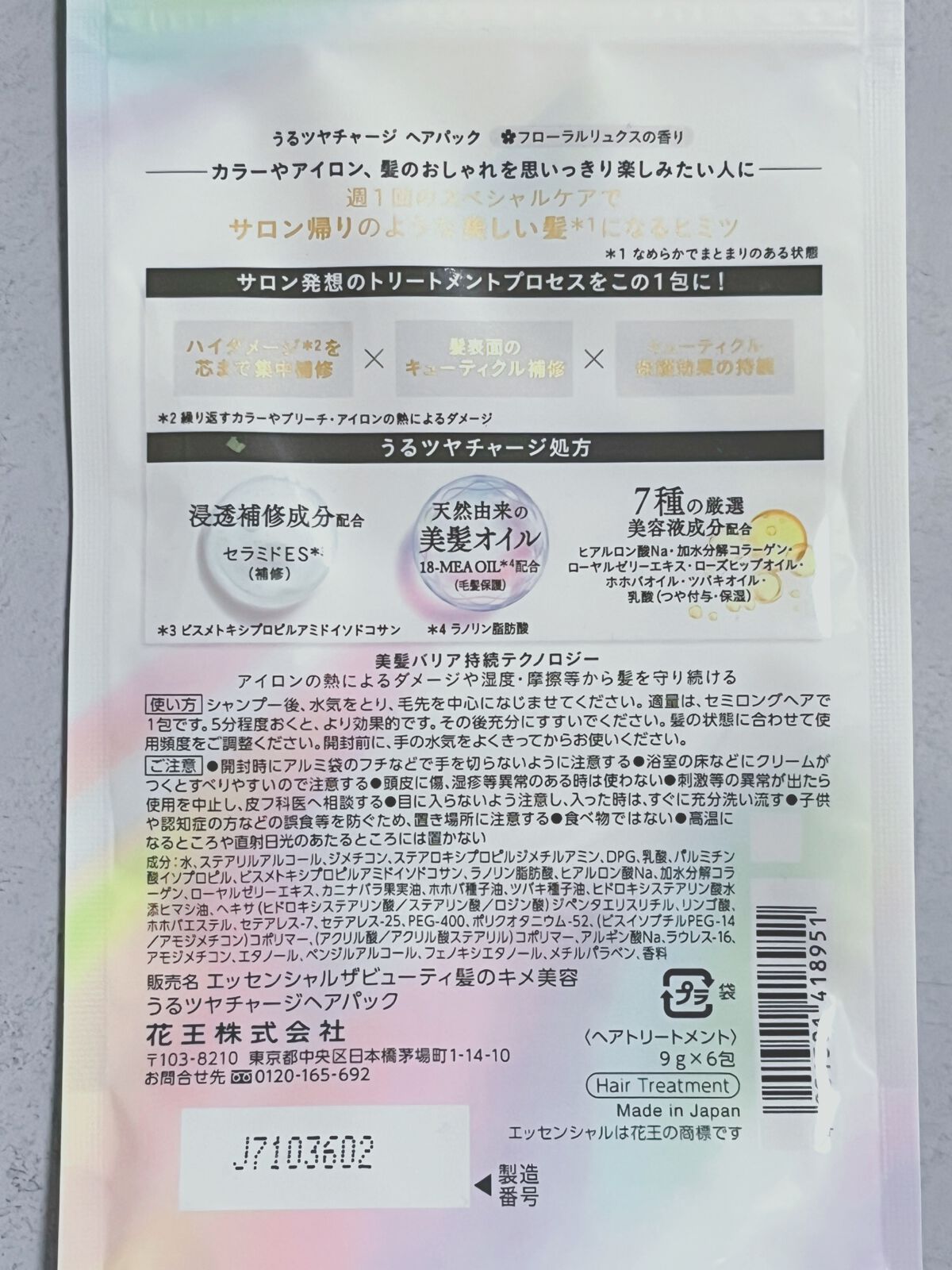 - ○カラーやアイロン、髪のおしゃれを思いっきり楽しみたい人に ○週1回のスペシャルケアで、サロン帰りのような美しい髪*へ(*なめらかでまとまりのある状態) 〇サロン発想のトリートメントプロセスがこの1包に! ○サロンのトリートメントプロセス ・ハイダメージ*を芯まで集中補修。(*繰り返すカラーやブリーチ・アイロンの熱によるダメージ) ・髪表面のキューティクルを補修 ・キューティクルの保護効果の持続 〇うるツヤチャージ処方 ・浸透補修成分配合:セラミドES*(補修)(*ビスメトキシプロピルアミドイソドコサン) ・天然由来の美髪オイル18-MEA OIL*配合(毛髪保護)(*ラノリン脂肪酸) ・7種の厳選美容液成分配合:ヒアルロン酸Na・加水分解コラーゲン・ローヤルゼリーエキス・ローズヒップオイル・ホホバホイル・ツバキオイル・乳酸(つや付与・保湿) 〇アイロン熱による髪ダメージや温度・摩擦等から髪を守り続ける”美髪バリア持続テクノロジー” 〇フローラルリュクスの香り