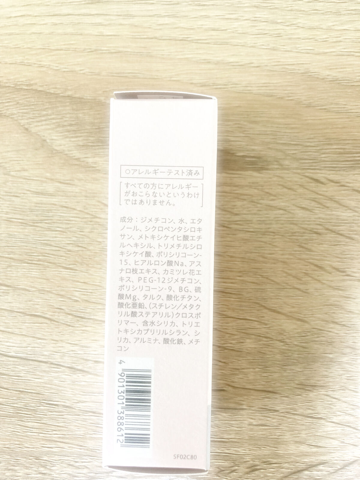 - <自然で明るく きれいな仕上がり(レギュラータイプ) > ジメチコン、水、エタノール、シクロペンタシロキサン、メトキシケイヒ酸エチルヘキシル、トリメチルシロキシケイ酸、ポリシリコーン-15、ヒアルロン酸Na、アスナロ枝エキス、カミツレ花エキス、PEG-12ジメチコン、ポリシリコーン-9、BG、硫酸Mg、タルク、酸化チタン、酸化亜鉛、(スチレン/メタクリル酸ステアリル)クロスポリマー、含水シリカ、トリエトキシカプリリルシラン、シリカ、アルミナ、酸化鉄、メチコン <自然にトーンアップしたきれいな仕上がり(トーンアップタイプ)> ジメチコン、水、エタノール、シクロペンタシロキサン、メトキシケイヒ酸エチルヘキシル、トリメチルシロキシケイ酸、ポリシリコーン-15、ヒアルロン酸Na、アスナロ枝エキス、カミツレ花エキス、PEG-12ジメチコン、ポリシリコーン-9、BG、硫酸Mg、酸化チタン、酸化亜鉛、タルク、(スチレン/メタクリル酸ステアリル)クロスポリマー、含水シリカ、トリエトキシカプリリルシラン、酸化鉄、シリカ、アルミナ、メチコン