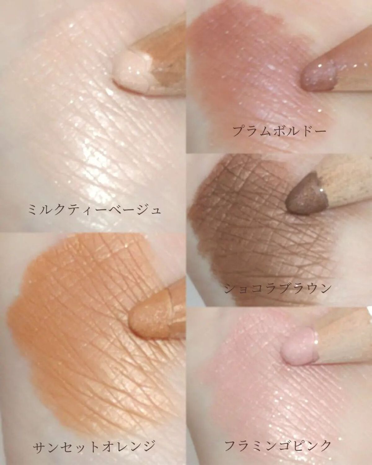 - <01 ミルクティーベージュ> マイカ、(ジメチコン/ジビニルジメチコン/シルセスキオキサン)クロスポリマー、シリカ、ナイロン−12、ポリメタクリル酸メチル、ベヘノキシPEG−10ジメチコン、ヤシ油脂肪酸イソアミル、ジメチコン、窒化ホウ素、合成フルオロフロゴパイト、ペンチレングリコール、トリ(ベヘン酸/イソステアリン酸/エイコサン二酸)グリセリル、カプリリルグリコール、クエン酸トリエチル、ケイ酸(Al/Mg)、エチルヘキシルグリセリン、アルギン酸Na、ポリアクリル酸Na、カプリルヒドロキサム酸、グリセリン、トコフェロール (+/-) 酸化チタン、酸化鉄 <02 サンセットオレンジ> マイカ、(ジメチコン/ジビニルジメチコン/シルセスキオキサン)クロスポリマー、シリカ、ナイロン−12、ポリメタクリル酸メチル、ベヘノキシPEG−10ジメチコン、ヤシ油脂肪酸イソアミル、ジメチコン、窒化ホウ素、合成フルオロフロゴパイト、ペンチレングリコール、トリ(ベヘン酸/イソステアリン酸/エイコサン二酸)グリセリル、カプリリルグリコール、クエン酸トリエチル、ケイ酸(Al/Mg)、エチルヘキシルグリセリン、アルギン酸Na、ポリアクリル酸Na、カプリルヒドロキサム酸、グリセリン、トコフェロール (+/-) 酸化チタン、酸化鉄 <03 ショコラブラウン> マイカ、(ジメチコン/ジビニルジメチコン/シルセスキオキサン)クロスポリマー、シリカ、ナイロン−12、ポリメタクリル酸メチル、ベヘノキシPEG−10ジメチコン、ヤシ油脂肪酸イソアミル、ジメチコン、窒化ホウ素、合成フルオロフロゴパイト、ペンチレングリコール、トリ(ベヘン酸/イソステアリン酸/エイコサン二酸)グリセリル、カプリリルグリコール、クエン酸トリエチル、ケイ酸(Al/Mg)、エチルヘキシルグリセリン、アルギン酸Na、ポリアクリル酸Na、カプリルヒドロキサム酸、グリセリン、トコフェロール (+/-) 酸化チタン、酸化鉄 <04 プラムボルドー> マイカ、ホウケイ酸(Ca/Na)、(ジメチコン/ジビニルジメチコン/シルセスキオキサン)クロスポリマー、シリカ、ナイロン−12、ポリメタクリル酸メチル、ベヘノキシPEG−10ジメチコン、ヤシ油脂肪酸イソアミル、ジメチコン、窒化ホウ素、合成フルオロフロゴパイト、ペンチレングリコール、トリ(ベヘン酸/イソステアリン酸/エイコサン二酸)グリセリル、カプリリルグリコール、クエン酸トリエチル、ケイ酸(Al/Mg)、エチルヘキシルグリセリン、アルギン酸Na、ポリアクリル酸Na、カプリルヒドロキサム酸、グリセリン、トコフェロール (+/-) 酸化鉄、酸化チタン、酸化スズ <05 フラミンゴピンク> マイカ、(ジメチコン/ジビニルジメチコン/シルセスキオキサン)クロスポリマー、ホウケイ酸(Ca/Na)、シリカ、ナイロン−12、ポリメタクリル酸メチル、ベヘノキシPEG−10ジメチコン、ヤシ油脂肪酸イソアミル、ジメチコン、窒化ホウ素、合成フルオロフロゴパイト、ペンチレングリコール、トリ(ベヘン酸/イソステアリン酸/エイコサン二酸)グリセリル、カプリリルグリコール、クエン酸トリエチル、ケイ酸(Al/Mg)、エチルヘキシルグリセリン、アルギン酸Na、ポリアクリル酸Na、カプリルヒドロキサム酸、グリセリン、トコフェロール (+/-) 酸化チタン、酸化鉄、カルミン、酸化スズ