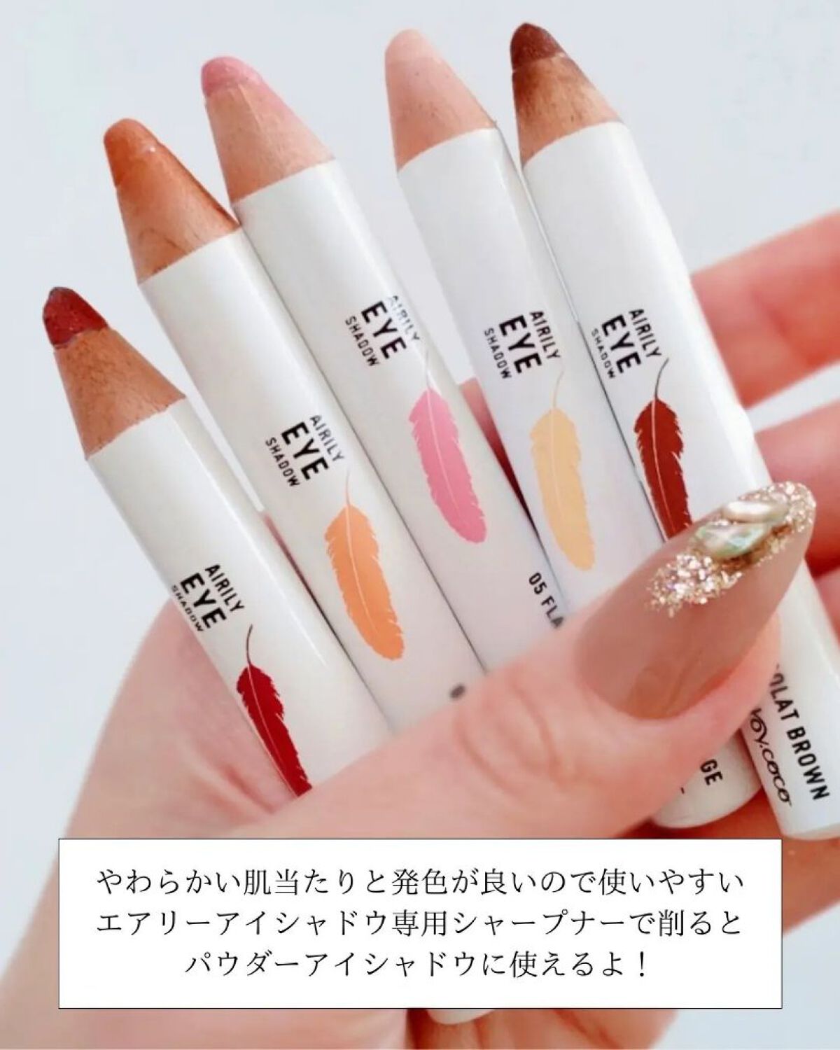 - スティックなのにパウダー。1本で思い通りのアイメイクが自由自在に描ける「ジョイココ エアリーアイシャドウ」。1本でアイメイクが完成できることを目指した新体験のアイシャドウ。指で優しく撫でるだけで好みのグラデーションを演出し、スティックだから気になる部分はピンポイントで狙えます。パウダーを優しく芯に閉じ込める特殊な技術で、ふんわり羽のように軽いエアリー感のある書き心地を実現。アイシャドウだけではなく、涙袋・ハイライト・チークにも使えます。