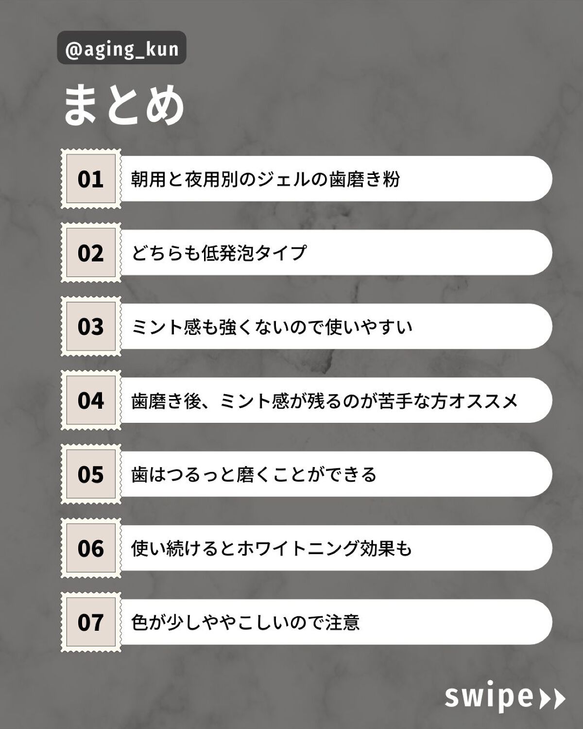 - ナイトジェル:溶剤:水、エタノール、BG/湿潤剤:濃グリセリン、ソルビット液、グリコシルトレハロース・水添デンプン分解物混合溶液/甘味剤:キシリトール、サッカリンNa/粘度調整剤:ヒドロキシエチルセルロース/粘結剤:結晶セルロース/pH調整剤:ピロリン酸ナトリウム/有効成分:モノフルオロリン酸ナトリウム、塩化セチルピリジニウム、塩酸クロルヘキシジン、酢酸トコフェロール※1/着香剤:香料(ハーブミントタイプ)/可溶剤:POE硬化ヒマシ油、ポリオキシエチレンラウリルエーテル/光沢剤:シクロペンタシロキサン、シクロヘキサシロキサン/分散剤:ショ糖脂肪酸エステル/安定剤:エデト酸塩/保存剤:イソプロピルメチルフェノール、パラベン モーニングペースト:清掃剤:無水ケイ酸※2、ピロリン酸カルシウム/湿潤剤:濃グリセリン、グリコシルトレハロース・水添デンプン分解物混合溶液/溶剤:水、PEG-8、エタノール/洗浄剤:ポリリン酸ナトリウム、キラヤエキス/粘結剤:PVP、結晶セルロース/粘度調整剤:CMC・Na/有効成分:モノフルオロリン酸ナトリウム、グリチルリチン酸ジカリウム、塩酸クロルへキシジン/着香剤:香料(ハーブミントタイプ)/着色剤:酸化Ti/可溶剤:POE硬化ヒマシ油/pH調整剤:重炭酸Na/発泡剤/:ラウロイルメチルタウリンNa/甘味剤:サッカリンNa/保存剤:パラベン