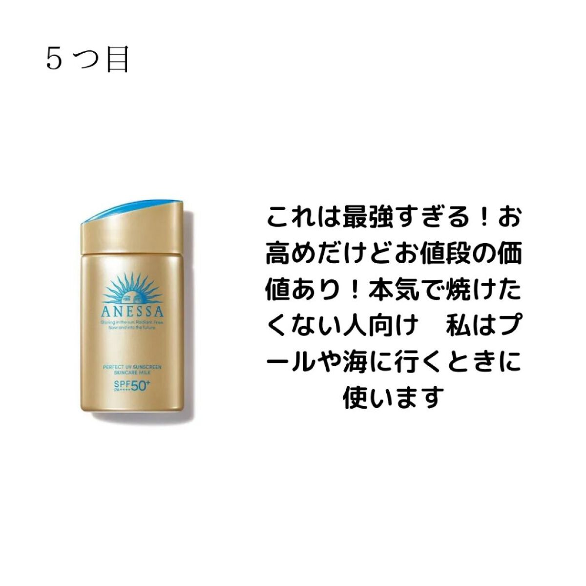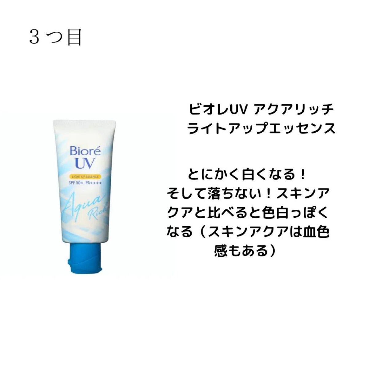 ビオレUV アクアリッチウォータリージェル 塗ると少しトーンアップします! スーパーウォータープルーフで落ちにくいです スキンアクアトーンアップUVエッセンス これは本当にトーンアップしてめっちゃ白くなる ビオレUV アクアリッチ ライトアップエッセンス 色白っぽくなる!結構落ちにくい ニベアUV ディープ プロテクト&ケア ジェル スーパーウォータープルーフで落ちにくく焼けない! アネッサパーフェクトUV スキンケアミルク N これは本当に焼けないからおすすめ!! 全然落ちずに水を弾く!