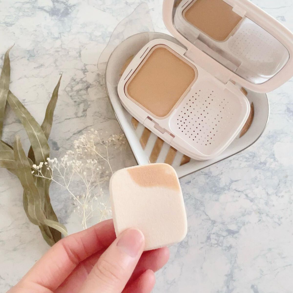 シミ・くすみ・毛穴目立ちなどの肌悩みにも自然な明るさで美しくカバー力があるつるたま肌仕上がりを叶えるファンデ♡ 薄型でシンプルなパッケージ!リフィルはカチッとはめ込むタイプでパウダーの上に透明カバーがついていて衛生的! 自然な明るさで1番明るい色味でも(01明るめ使用)白浮せず素肌に馴染むような仕上がり👏