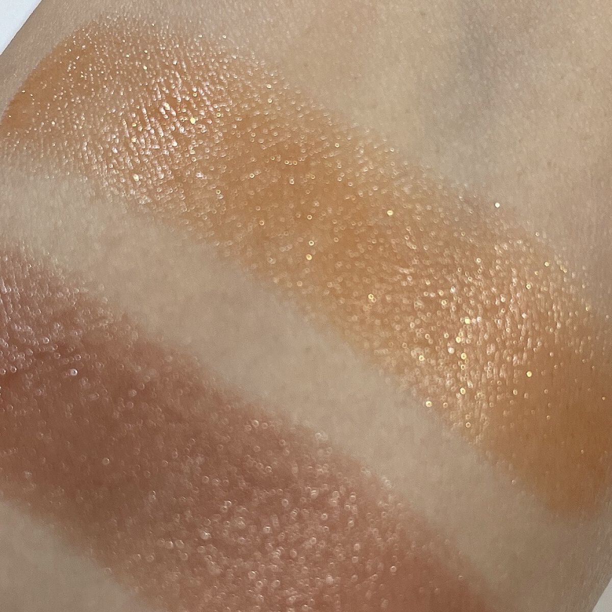 mude.の方がよりあたたかみのある印象で全体的に使いやすい色味が入っている感じ◎ ラメ感もギラギラするよりかは上品なキラキラ感✨ rom&ndはmude.に比べるとフレッシュな印象!春や夏に使うと映えそう❣️ ラメ感も強く、目立つかな。 似てるかもしれないからと買うのを長い間悩んでいましたが、仕上がりが全然変わってくるので、買って良かった😂❤️ 粉質はブランドも違うので違ったよ✨ rom&ndの方がしっとり感があって強く発色する感じ。 mude.は淡い発色で、初心者さんも使いやすいと思った🫶🏻