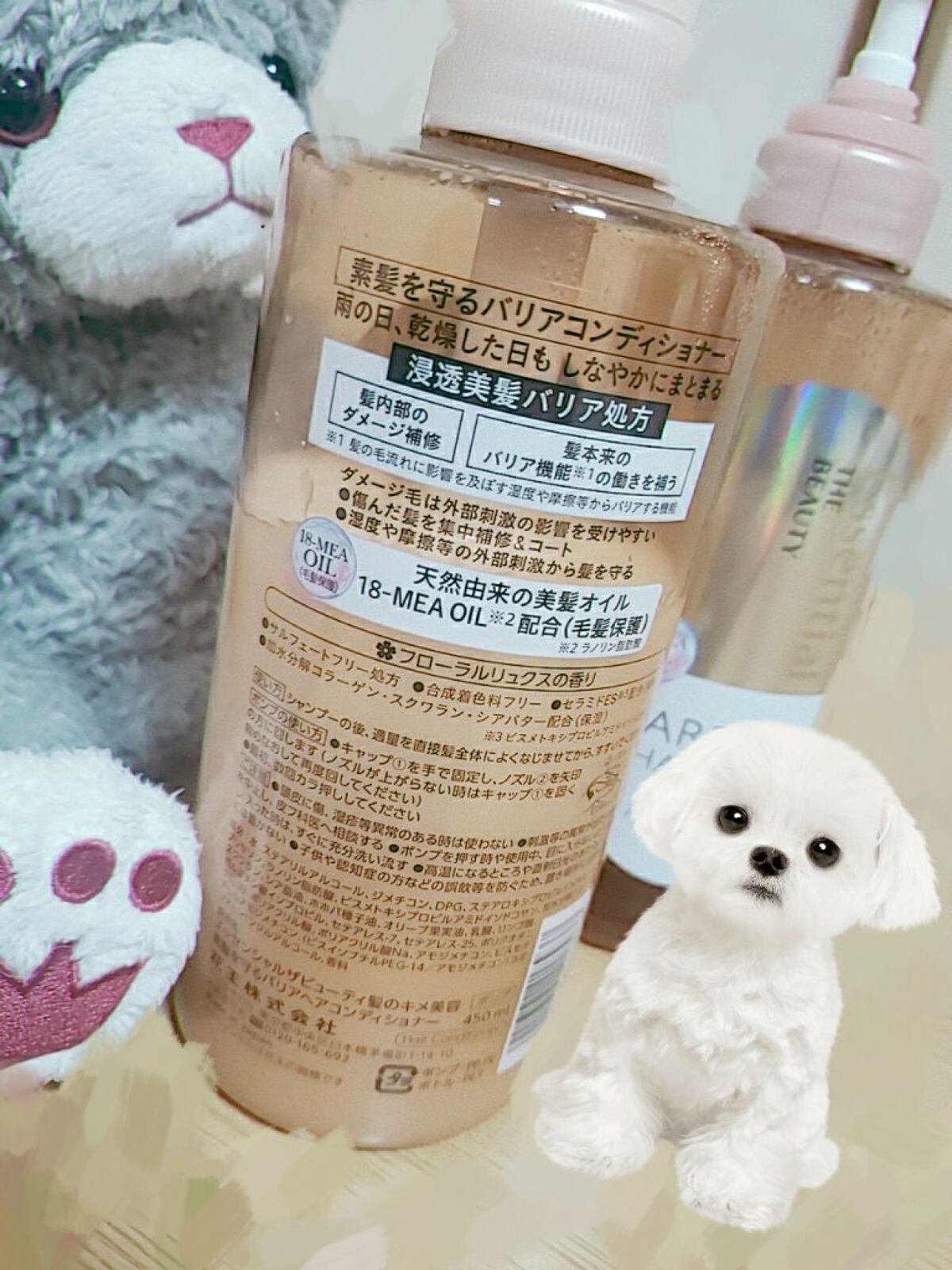 - うる髪続くバリアシャンプー・コンディショナー 雨の日、乾燥した日も しなやかにまとまる 【バリアシャンプー・コンディショナー共通】 ●浸透美髪バリア処方 ・髪内部のダメージ補修 ・ 髪本来のバリア機能*の働きを補う *髪の毛流れに変化を及ぼす湿度・摩擦等からバリアする機能 ●天然由来の美髪オイル 18-MEA OIL*配合(毛髪保護)*ラノリン脂肪酸 ●サルフェートフリー処方 ●合成着色料フリー ●加水分解コラーゲン・スクワラン・シアバター配合(保湿) ✿フローラルリュクスの香り 【バリアシャンプー】 ●3種のアミノ酸系洗浄成分使用 ●とろふわスフレ泡で素髪が持つ美髪成分*を守りながらやさしく洗う *タンパク質、脂質 ●ノンシリコーン処方 【バリアコンディショナー】 ●傷んだ髪を集中補修&コート ●湿度や摩擦等の外部刺激から髪を守る ●セラミドES*配合(補修)*ビスメトキシプロプルアミドイソドコサン
