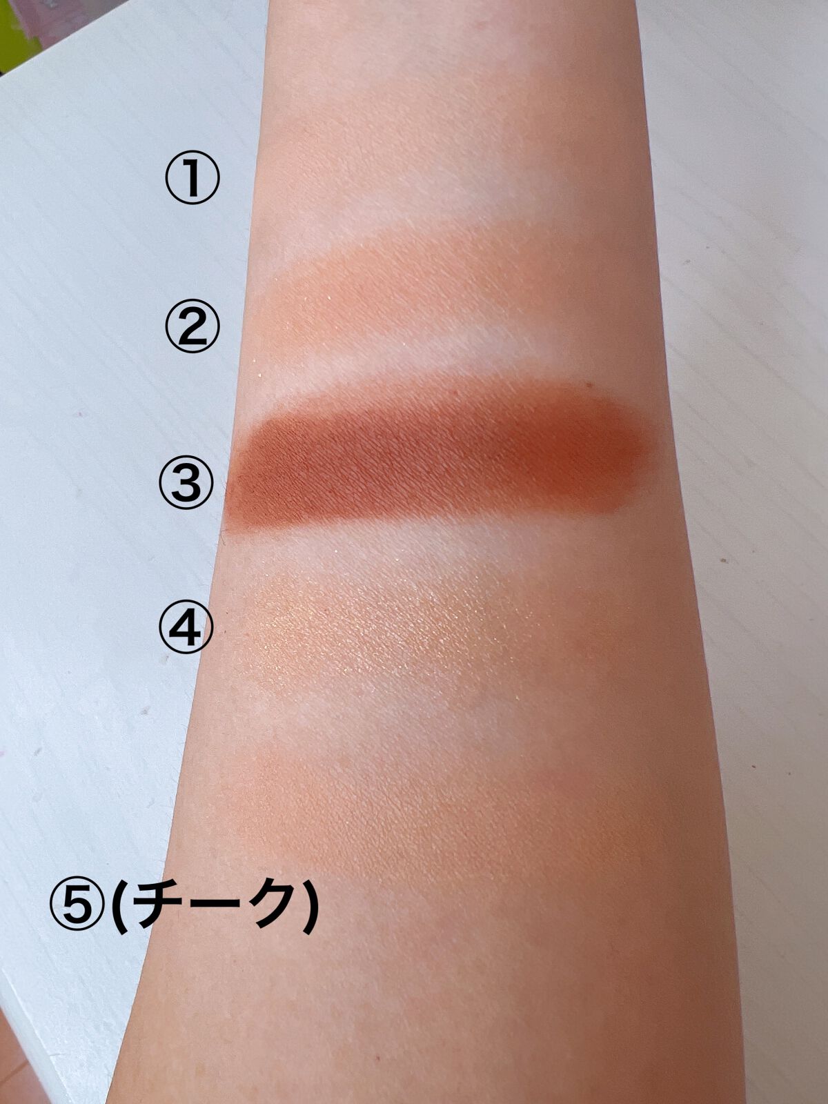 マットだけどどこかツヤ感もあるような柔らかい粉質……なのに粉飛びも少なめなので 瞼に乗せやすい🥰 5番のラメ感は控えめ。 シャンパンカラーに多色ラメがチラッ|˙꒳˙)✨ 実はこの番号通りにカラーを使うとプロ並みのメイクが完成するらしいです……‼️ ケースも薄くてコンパクトなのにベースカラー、ラメ、締め色、チークまで付いてるので 持ち運びやいつか行けるようになるであろう旅行などにも良さそうです❣️