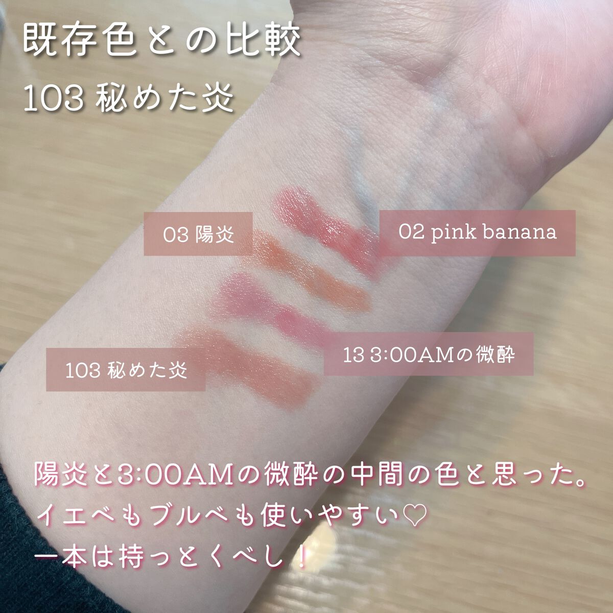 101番 1/365の日の出🌤 黄味が鮮やかなオレンジリップにゴールドラメがちらちら光って可愛いモンスター🧡👄 103番 秘めた炎❤️🔥 ナチュラルな粘膜色でイエベブルベ問わず使いやすいまろやかな色味。03番陽炎と13番3:00AMの微酔を足して割ったような色合いかな?