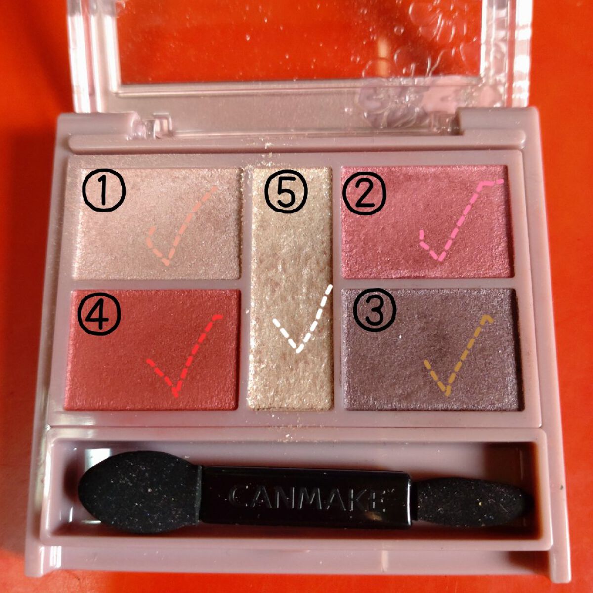 - 1枚のパレットで2つのスタイルが完成! 5色の欲ばりアイシャドウ♥ メインカラーを選んで2つのスタイルが楽しめる! A→B→D でスタイル1 A→C→D でスタイル2 繊細な粉質が、しっとりとまぶたに密着して色落ちを防ぎます。 透明感のあるキラうるトッピングジュエル(繊細ラメ)は、気分によってトッピング!