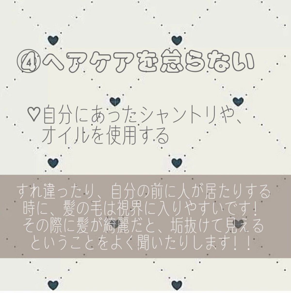 ♡ 堂々としてみえる(凄く大事 !) ♡スタイル良く見える ♡かっこよく、印象がよく見える 少しなら、明るくて楽しそうな先輩、後輩だな〜ってなると思うので、楽しむのは大事だと思います !! ♡入る光が多くて、キラキラした目にみえる ♡目が大きくて印象的に見える ♡マスクをしていても印象に残りやすい また、可愛いく印象的な人のまつ毛は、長く、コシがある子がほんとに多いです !! 実際、すれ違う際や、うしろから見た時に1番最初に気になるところは髪だという方も多くいます ! (私もです) また、髪の毛が綺麗にまとまって整って居ると、清潔感が凄く出ますよね ! 自分の髪質に合うオイル、リンスを選んだり、寝癖がつかないように意識することが大事です 前髪って、案外顔の印象だけでなく、雰囲気も変える事ができるそうです ! 眉毛を整えることで、♡清潔感がでる ♡アーチ眉にすることで、柔らかい印象に ♡顔の印象が良くなる