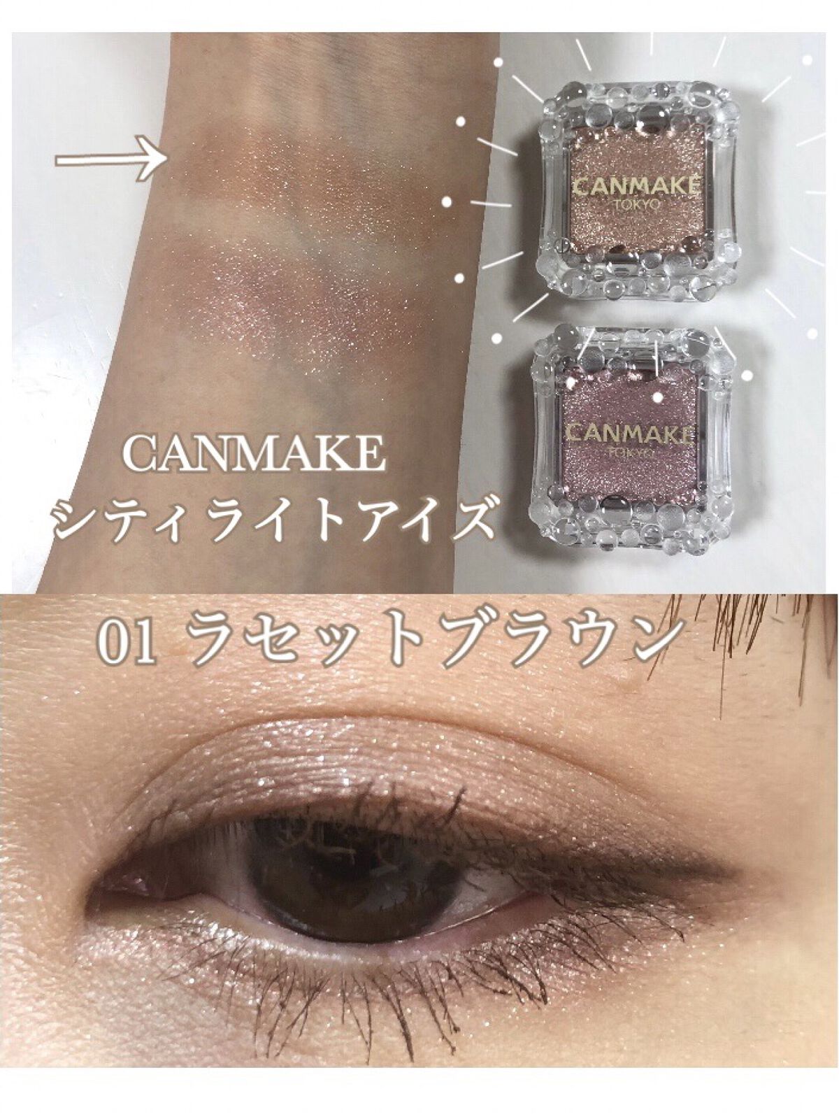 CANMAKEシティライトアイズ【使った商品】03オーキッドモーヴ【商品の特徴】¥638円(税込)高輝度ラメ配合【使用感】ややしっとりした粉質指塗りだとラメや発色をしっかりと感じ輝度や大きさもより感じやすいブラシ塗りだと透け感のある発色で血色...