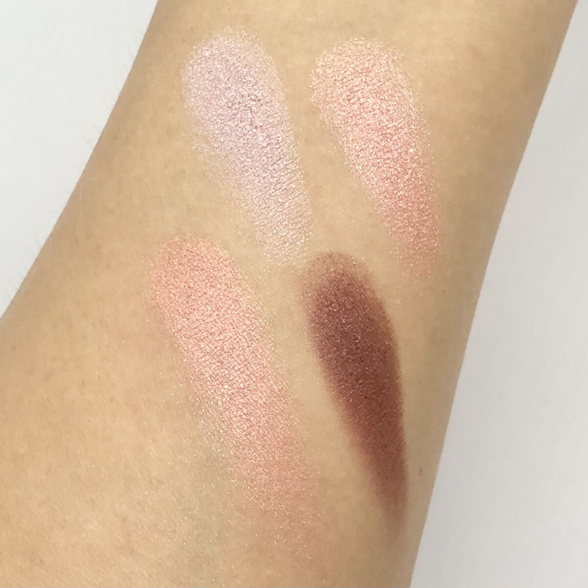 全体的には、名前のとおりヌーディーな印象☺️定番色「01 本命のブラウン」と似てるんだけど、今回の「104 本能のヌードベージュ」の方が、よりヌーディーなカラーとなっておりまする💁🏻♀️ 左上のベージュカラー(1番)は、基本的にはマットカラーなんだけど、ほんのりラメも入ってるから、のっぺりとした印象にならなくて良き🥰 4番のカラーは、ハイライトとして使うこともできるし、個人的には涙袋に使っても良いのではないかと思っておりまする👻 こちらは、全体的にしっとりとしたテクスチャーとなっておりまする💖そして、上2色のマットカラーが、結構しっかり発色してくれます❣️ 右下のハイライトカラーも、「104 本能のヌードベージュ」ほど白っぽくならないので、さりげなくハイライトを入れたい人にピッタリ✨