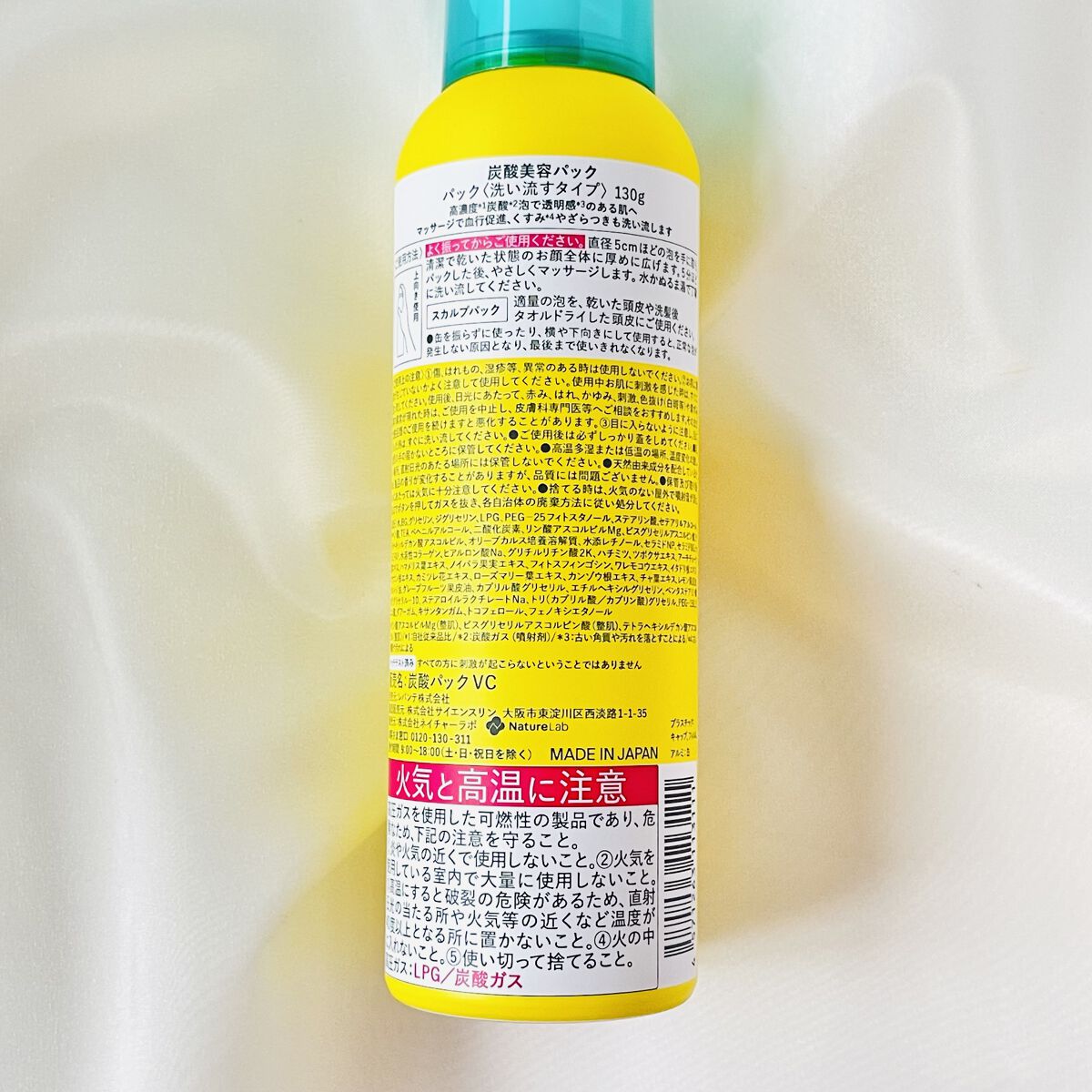 - ビタミンC誘導体(*1)配合、高濃度(*2)の炭酸(*3)泡で透明感のある肌へ導く炭酸美容パック。 マッサージで血行促進、くすみ(*4)やざらつきも洗い流します。 スカルプパックとして頭皮にもご使用頂けます。 *1 リン酸アスコルビルMg(整肌)、ビスグリセリルアスコルビン酸(整肌)、テトラヘキシルデカン酸アスコルビル(整肌) *2 自社従来品比 *3 炭酸ガス(噴射剤) *4古い角質による