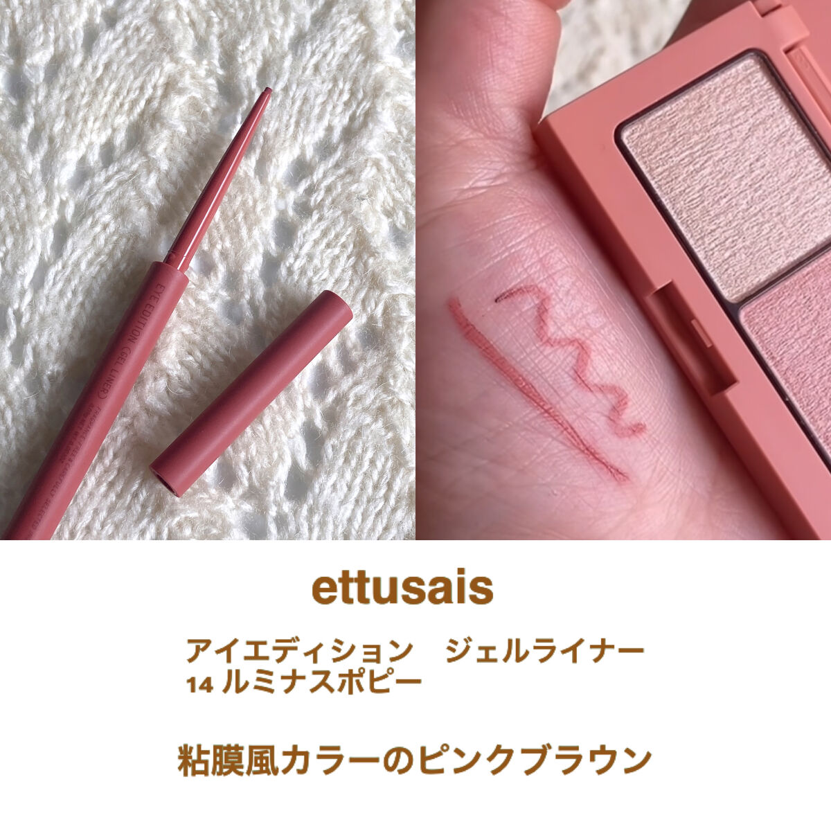 ettusaisのアイエディション カラーパレット21アプリコットチュールはPC問わず使えるコーラルベージュシャドウ×多色パール入りのパープルシャドウのパレット🫶 ラスティング ジェルライナー18アプリコットブラウンはアプリコットカラーな春色ブラウンライナー🌸 温かみのある使いやすいカラーだよ✨️