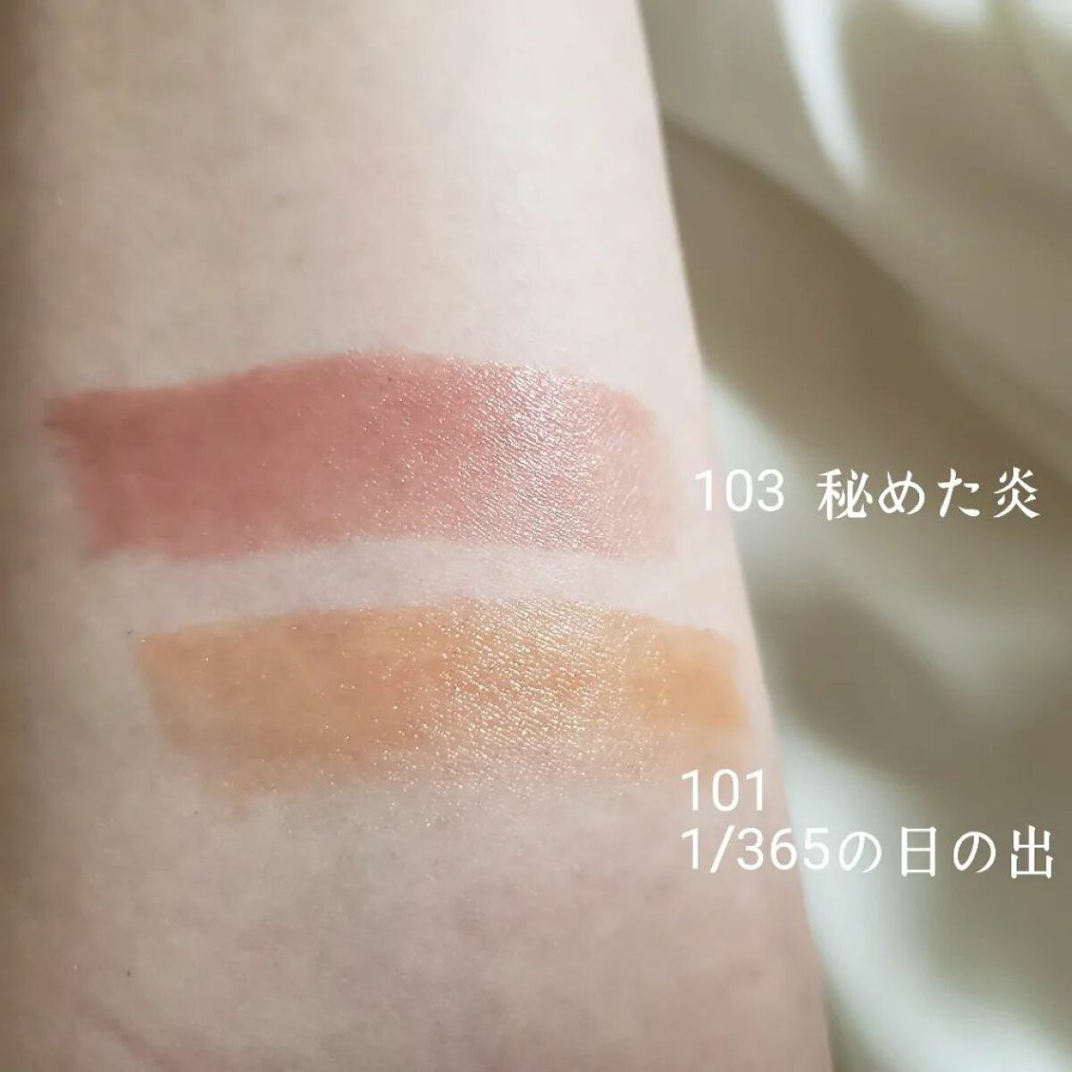 103秘めた炎 みんな狙ってたんじゃないでしょうか。 101 1/365の日の出 【14憧れの日光浴】にラメ足しただけでしょ、 ラメはミニ限定で迷惑な存在ってわかったから買う必要無しって思ってたけど、実際つけたら全然ラメ砂利しないし、ラメが繊細で目立たない。