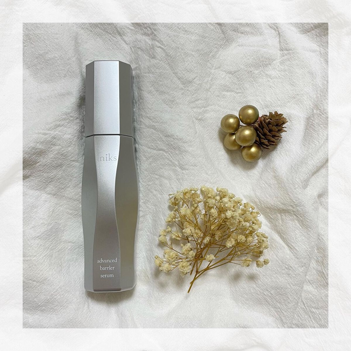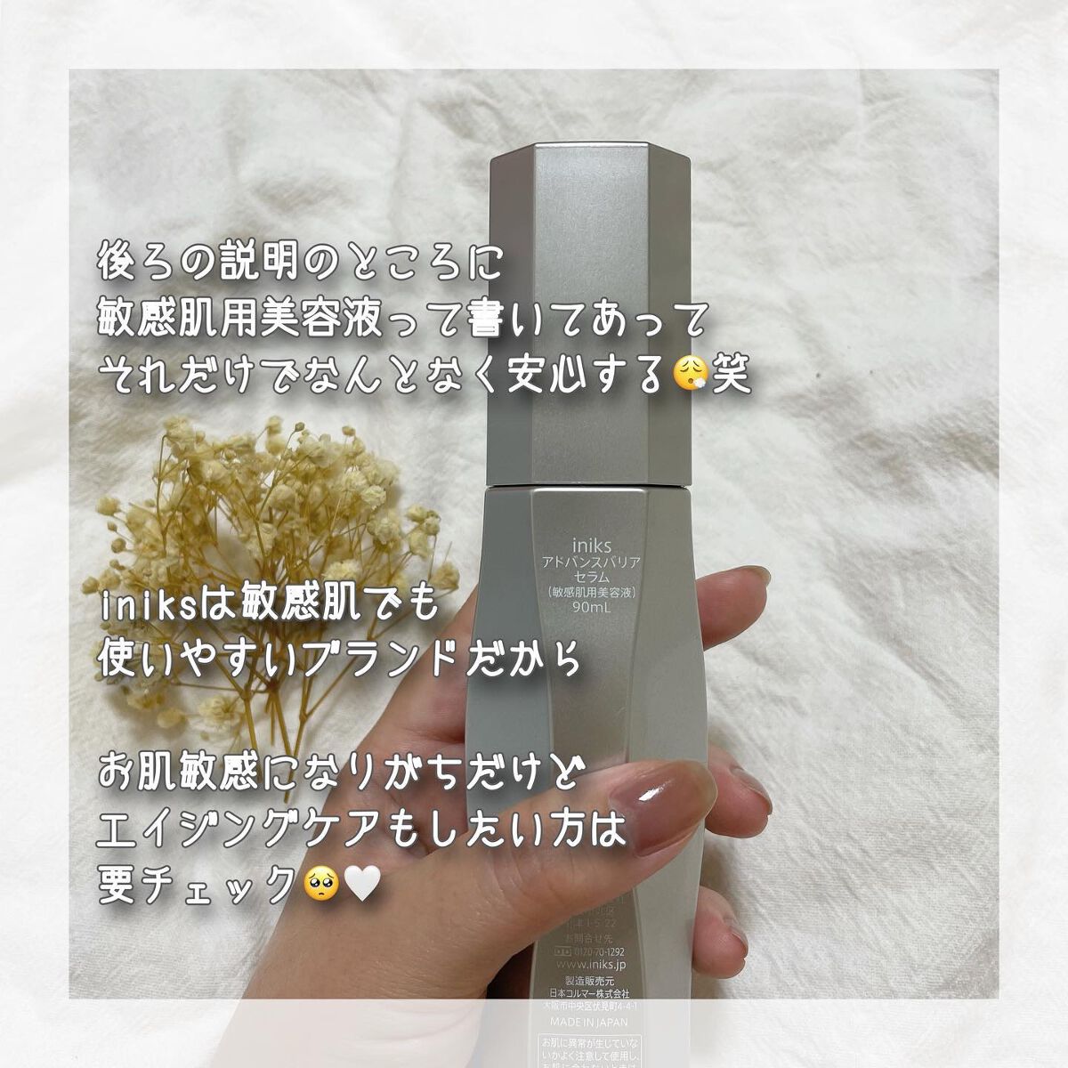 敏感肌に寄り添うiniksの年齢を感じはじめた敏感肌のためのバリアエイジングケア(年齢に応じたケア)ライン🥺🤍肌のバリア機能の低下に着目していてうるおいを蓄える角層バリアを整えてくれる美容液🧴🫧 敏感肌に配慮したスキンケアとエイジングケア(年齢に応じたケア)のどっちともケアしたい方にとってもおすすめ🫢🤍無香料、無着色、アルコール(エチルアルコール)フリーなのはもちろん、低刺激処方で敏感肌に配慮した処方設計。 そしてこの美容液の特徴は、アップポリマーが肌表面に密着してやわらかな膜でぴったり固定されるから肌になじんだ瞬間からピンとしたハリをもたらしてくれるんだって🫣 それから、コラーゲンースター配合で角層深くへ浸透してくれるから肌につやを与えながら、年齢サインを感じやすい敏感肌の弾力を守ってくれる◎使用感はとろみのある半透明のテクスチャでぺたぺた感はあんまりなかったかな?☺️