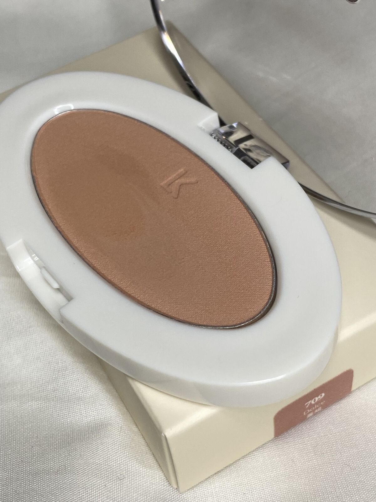楕円形のころんとしたシルエットからして可愛らしいチーク! 709 ドルチェというヌーディベージュカラーを愛用しています✨ シルキーな質感と繊細なパール感が可愛い…🥹 ツヤ感や立体感がありながらよく肌に馴染むから、どんなメイクにも合わせやすくて完全に私の中で一軍チークです🫶