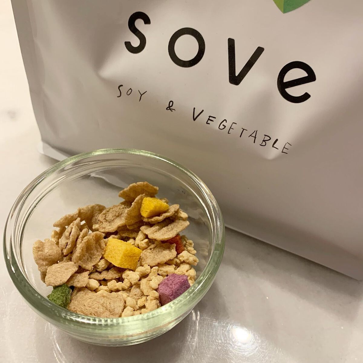 大豆と野菜をシリアルに 2種の大豆フレークと4種の野菜キューブ。サクサクとしたクリスピー食感と素材本来の美味しさ。 植物性たんぱく質と食物繊維がとれる 1食分30gで、タンパク質15.8g・食物繊維6.7g、糖質は3.9gです。 甘さをおさえているので、色んな味わいが楽しめます そのままでも、牛乳や植物性ミルクと、サラダやスープに加えても。