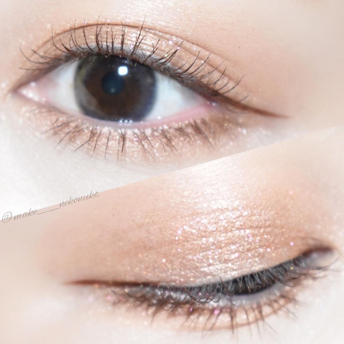 イリデッセントピンク&ゴールドスパークル。透明感のある青みピンクベースにゴールドラメが含まれていてめちゃくちゃ可愛い! 一度塗りだと淡めでキラキラ。重ねて塗ると色みが出てきます。 涙袋に使っても可愛いカラーです◡̈
