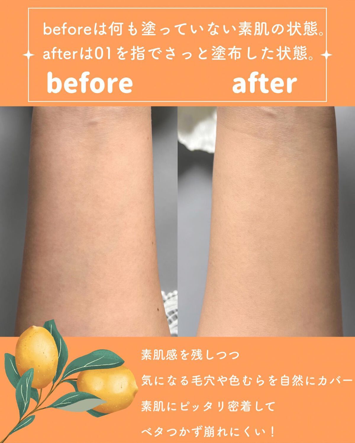 - ビタミンC配合*1 下地以上ファンデ未満、これ1本で! 朝10秒、トーンアップ*2ツヤ肌へ ① ビタミンC配合*1 スキンケア発想、 つけるたび、心地よいうるおい感つづく ② 内からあふれるような、ツヤと透明感 目覚めのくすみ肌に、血色トーンアップ*2 べたつきにくいのに、ヘルシーなグロウ肌に*2 ③ すっぴん風、毛穴レス素肌へ*2 みずみずしく軽いのに、毛穴を自然にぼかす 素肌にぴったり密着、崩れにくい 【注釈】 *1 ビタミンC誘導体のこと。アスコルビルグルコシド(整肌成分) *2 メイクアップ効果