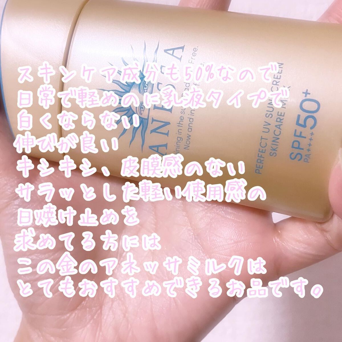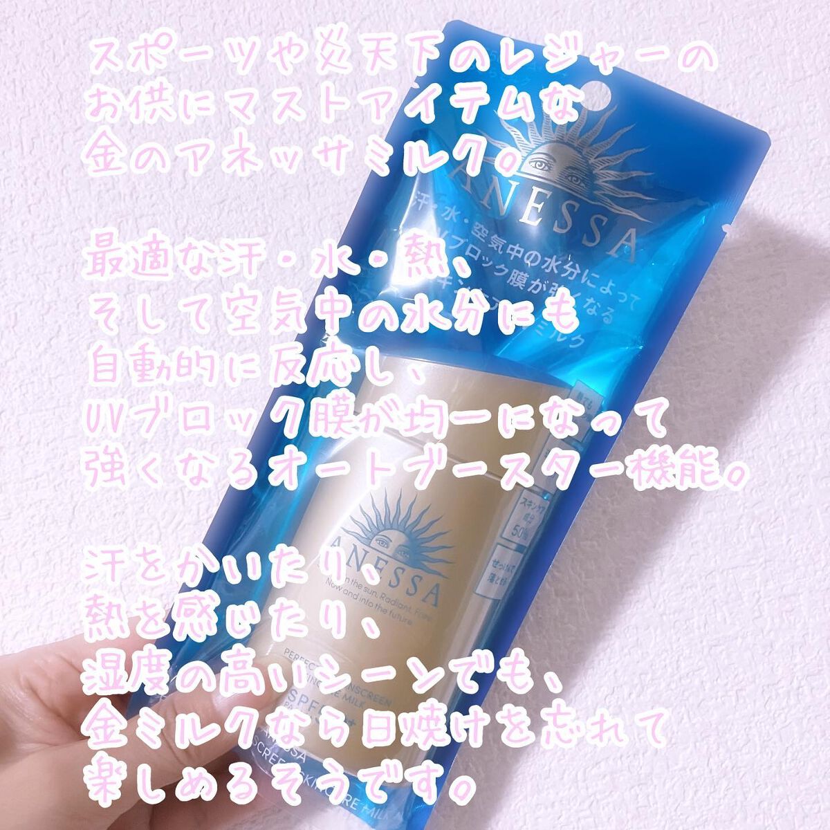 - 顔・からだ用 SPF50+ ・ PA++++ 汗、水、熱、そして空気中の水分に反応してUVブロック膜が強くなる技術搭載 最強※8 UVスキンケアミルク ※8 「最強」とはSPF50+・PA++++、及びアネッサ内ウォータープルーフ効果を意味する。 〇汗・水・熱、そして空気中の水分に自動的に反応して、UVブロック膜が強くなります。-オートブースター技術 〇透明美肌仕上げ-ビューティーアップ効果 “ビューティーアップ粉末”を新配合透明感のある美しいつや肌へ ○スキ ン ケア成 分 50% 配合 〇植物由来成分をブレンドした、紫外線による 乾燥 ダメージを防 ぐ 、うるおいを与える保湿美肌成分 黄花エキス、緑茶エキス、異性化糖、グリセリン 〇保湿 成分 コラーゲン、 スーパーヒアルロン酸※ 9 、 グリセリン ※9 アセチルヒアルロン 酸 Na 〇保湿持続 効果 ○スーパーウォータープルーフ 〇マスク蒸れ対応 〇耐こすれ ○化粧下地効果 ○せっけんで落とせ る 〇さらさらミルク ○生まれ変わった 、 心地よいフルーティーフローラルの香り 〇大気中に浮遊する微粒子、 PM2 .5 などから肌を保護 し ま す。-微粒子付着防止対応 ○砂が肌 につきにくいサンドプルーフ効果 〇海に流れ出にくいオーシャンフレンドリー処方※6 ※6 自社品内の耐水処方でない商品と比較 ○環境に優しいサステナブルなボトル ○植物由来の原料を一部使用した袋 〇オキシベンゾン 、 オクチノキサート無配合 ○無着色・ ノンコメドジェニックテスト・ アレルギーテスト済み (全ての方にニキビができない、アレルギ ーが起きないというわ けではありません)