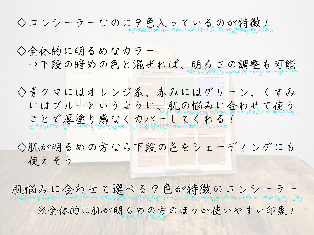 - 様々な肌トーンを考慮した9つのカバーシェードで全ての肌タイプの欠点をカバー補正してくれるカスタムコンシーラーパレット。 【Point1】様々な肌トーンと明るさを考えに入れた9つのカバーシェード。 【Point2】肌トーンに合う自分だけのカラーでカスタマイズ。 【Point3】反対色を活用したカラーコレクティングメイクアップ。 【Point4】浮きにくく密着感の高いしっとり&もっちりテクスチャー。