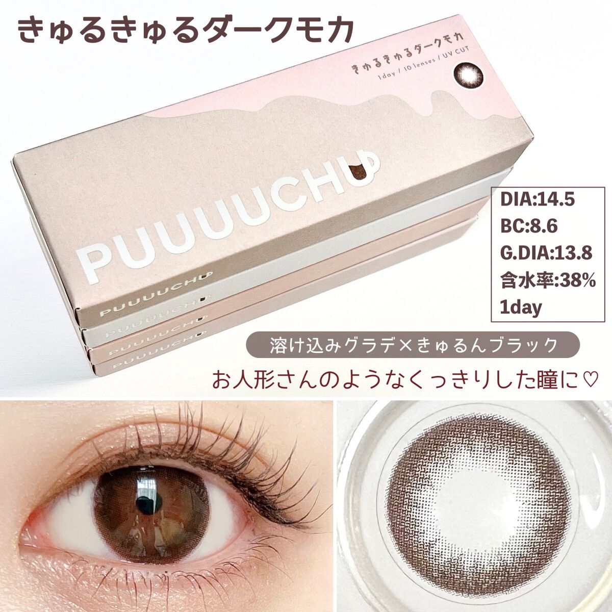 - ※2023年7月よりパッケージ底面カラー名表記部分、順次リニューアル。尚、これに係る商品の返品・交換等は承っておりません。 女の子の「かわいい」がぜーんぶ叶うよくばりなラインナップ 絶対ばぶフェイス♡ちゅるんチョコフラッペ DIA14.2mm/着色直径13.5mm 細フチ×ピュアベージュ ピュアちゅるんレンズで守りたくなっちゃうような甘めの瞳に 王道人類モテ♡ふわふわカプチーノ DIA14.5mm/着色直径13.7mm ぽんわりフチ×ふわブラウン フチふんわりシフォンブラウンレンズで優し気な瞳に 超絶盛れ地雷女子♡きゅるきゅるダークモカ DIA14.5mm/着色直径13.8mm 溶け込みグラデ×きゅるんブラック くっきり暗めカラーレンズでお人形さんみたいにくっきりとした印象の瞳に 韓国系クール美人♡ぷるるんソーダフロート DIA14.2mm/着色直径13.2mm うるうる質感×透明感ブルー うるうる透明感ブルーグレーレンズでクールビューティーな瞳に 商品名 :PUUUUCHU(プーチュ) 価格 :1,650円 税込(10枚入り) カラー :全4色 レンズ :BC8.6mm DIA14.2mm/14.5mm UVカット 含水率 :38% 使用期間 :終日装用、一日交換 度数 :0.00D(度なし),-0.50D~-6.00D(0.25D刻み),-6.50D~-10.00D(0.50D刻み) 販売名 :ワンデーツッティアルファ 承認番号 :22400BZX00427000 カラーコンタクトレンズの不適正使用による眼障害の危険性等などがあります。 ●コンタクトレンズは高度管理医療機器です。不十分な洗浄・消毒など不適切なケアや、長時間・交換期間を超えた装用により、アレルギー性結膜炎、角膜感染症、角膜潰瘍等の重篤な眼障害が発生する危険性があります ●ご使用前に取扱説明書を確認してください 使用上の留意事項 ●眼科医院等を受診してからお求めください ●眼に異常を感じたら直ちにレンズ使用を中止し、お近くの眼科等で診察を受けてください ●医師の指示にしたがってご使用ください ●コンタクトレンズを装用する場合、自覚症状がなくても、眼科医院等での定期検査を受けてください ●レンズに不具合がある場合は使用しないでください