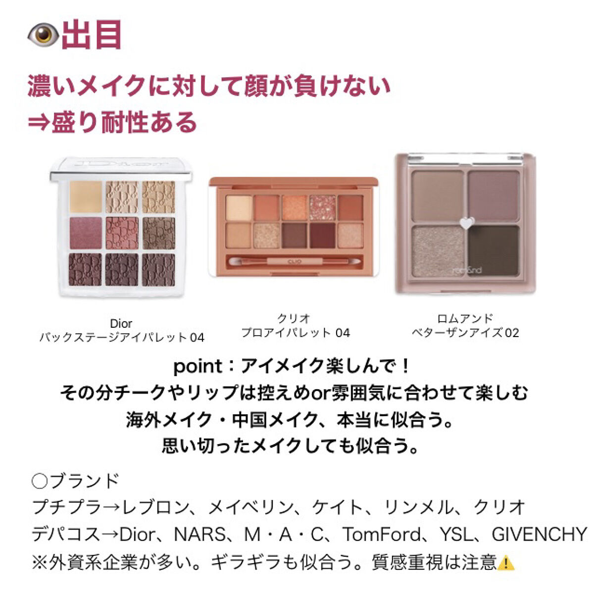 【顔をパーツでみて、知る】ということに重きを置いていきます。 自分の顔で好きなところを見つけて、生かす。 アイメイクは、一番最初に手を出すところかなと思ったからです。 これを知ることや深めることは、垢抜けに必要だと思いました!