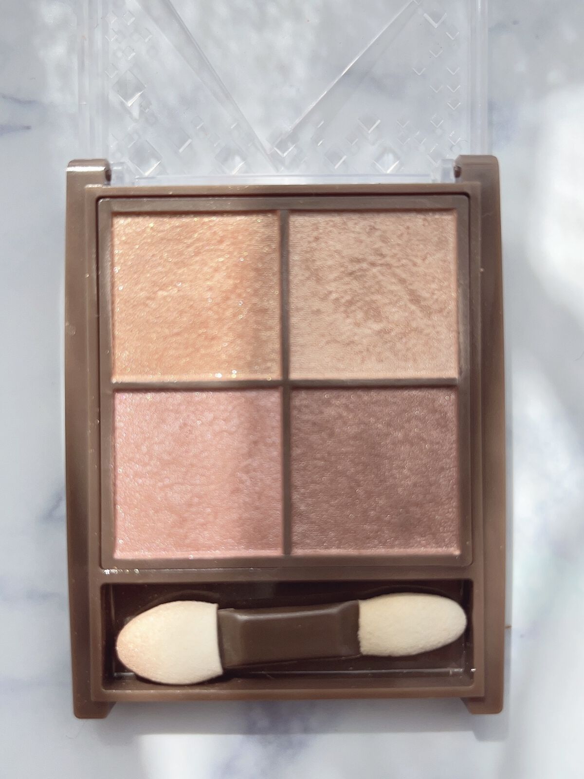 4色でグラデも単色でも可愛いニュアンスカラーのパレット。色を重ねても濁りにくいんだって! ラメが結構惜しみなく入っているので目元がキラキラになる! 色の残り方や発色の仕方はやはりプチプラ感あるかなって感じだけどラメがしっかり夕方までキラキラだったところはとても好感度高い💕