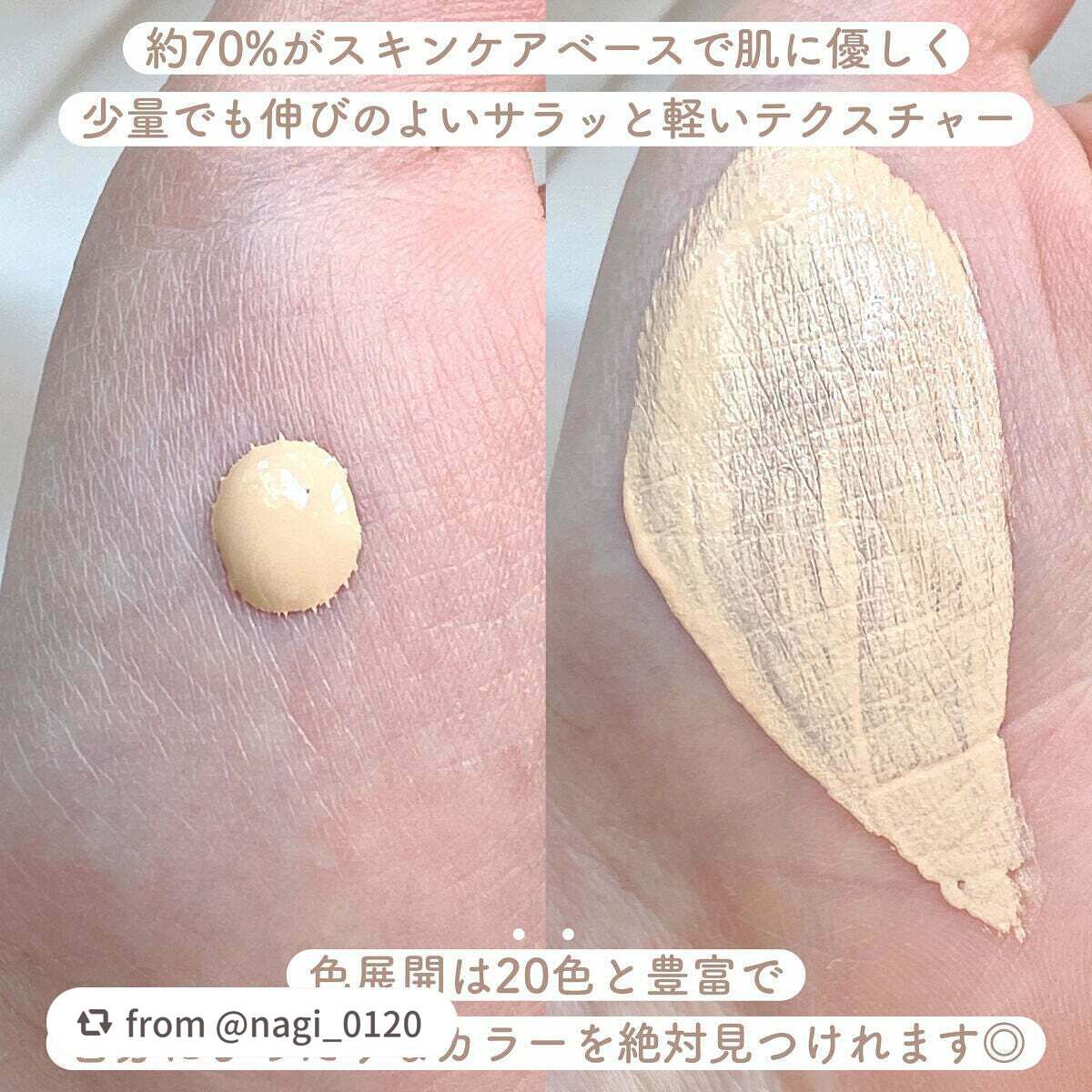 - 【この商品はリニューアルしました】 https://lipscosme.com/products/631202 薄く、軽く、そして続く。 あなたの個性を輝かせる、素肌美ファンデーション。 約70%スキンケアベースのフォーミュラが、潤いヴェールで肌を心地よく包み込む。 ファンデーションを感じさせないほど、薄くて軽いテクスチャー。 皮脂、汗に強く、時間が経っても崩れない。 カバー力がありながらも、素肌に溶け込むかのような自然な仕上がり。 アジア人のための20色で、テーラーメイドされたように個性輝く。 まるで美しい素肌を纏うような体験を、あなたの肌で。