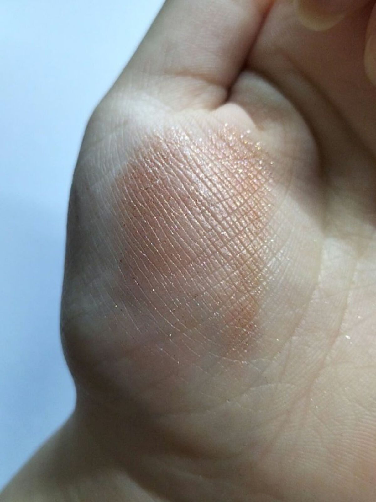 サーモンピンクのような色味のパレット。 柔らかい発色で、ベース、メイン、締め色、ラメが1色ずつ入っているパレットなので、とても使いやすくなっています。 ふんわりとした発色のチーク ラメが少し入っています。 ほんのりピンクのハイライト 血色感が出るので、チークとしても使えます。 もものようなピンク系のリップ とてもちゅるちゅるで、ティッシュオフしても色が残ります。