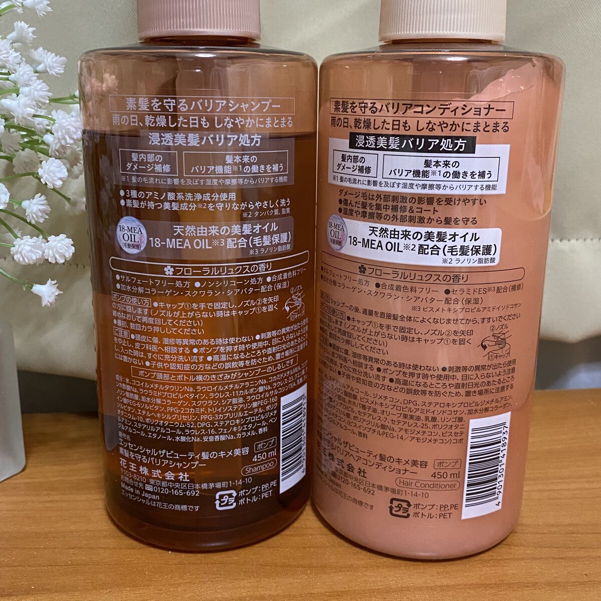- うる髪続くバリアシャンプー・コンディショナー 雨の日、乾燥した日も しなやかにまとまる 【バリアシャンプー・コンディショナー共通】 ●浸透美髪バリア処方 ・髪内部のダメージ補修 ・ 髪本来のバリア機能*の働きを補う *髪の毛流れに変化を及ぼす湿度・摩擦等からバリアする機能 ●天然由来の美髪オイル 18-MEA OIL*配合(毛髪保護)*ラノリン脂肪酸 ●サルフェートフリー処方 ●合成着色料フリー ●加水分解コラーゲン・スクワラン・シアバター配合(保湿) ✿フローラルリュクスの香り 【バリアシャンプー】 ●3種のアミノ酸系洗浄成分使用 ●とろふわスフレ泡で素髪が持つ美髪成分*を守りながらやさしく洗う *タンパク質、脂質 ●ノンシリコーン処方 【バリアコンディショナー】 ●傷んだ髪を集中補修&コート ●湿度や摩擦等の外部刺激から髪を守る ●セラミドES*配合(補修)*ビスメトキシプロプルアミドイソドコサン