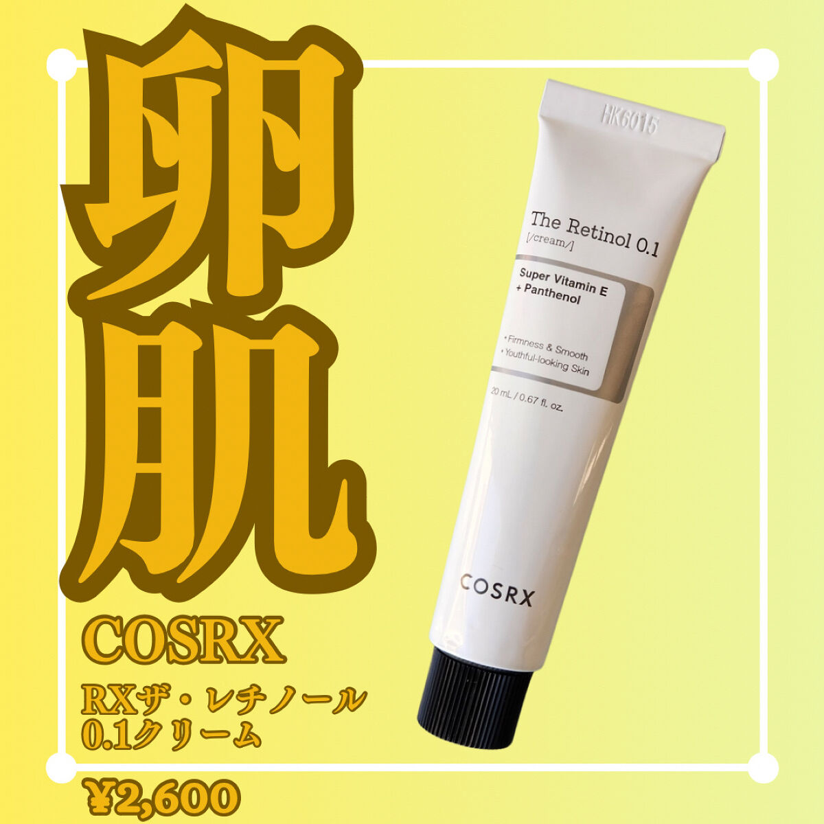 使い切りスキンケアCOSRXRXザ・レチノール0.1クリームリピ中のレチノールクリームとにかくコスパが良い劇的な変化はないけど使い続けることで将来の肌貯金になると信じてます肌はわりと強い方だとは思いますがA反応は全くなし低刺激ではありますが投...